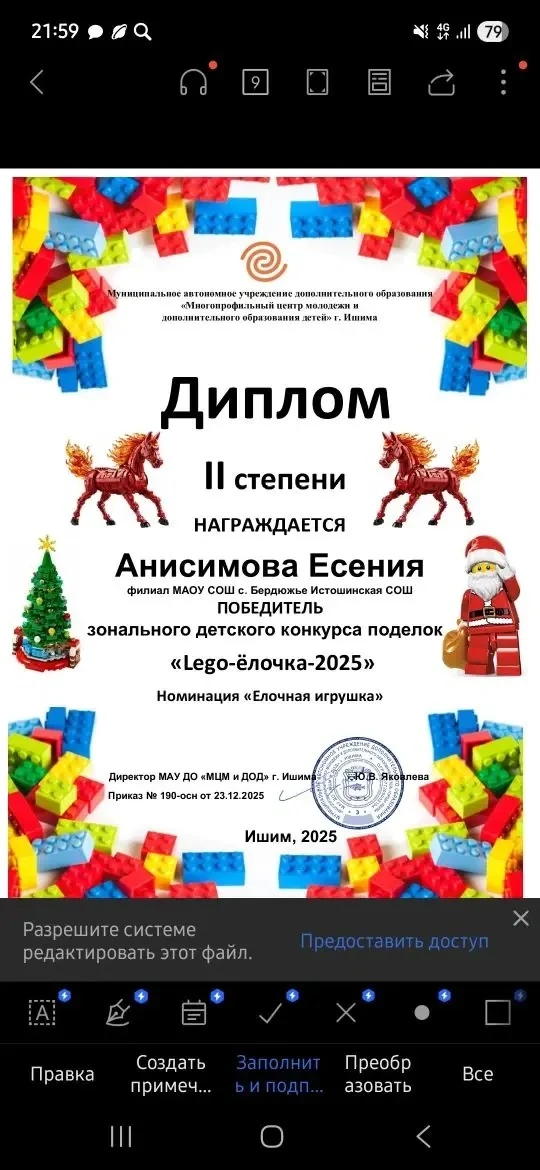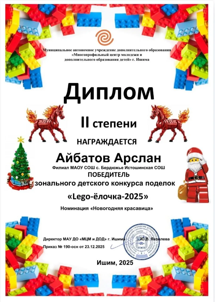 Поздравляем Анисимову Есению, ученицу 1 класса и Айбатова Арслана, ученика 3 класса Истошинской школы с дипломами 2 степени за участие в зональном детском конкурсе поделок "Lego- ёлочка", который проходил в декабре 2025 года в городе Ишиме. Молодцы, ребята!!!