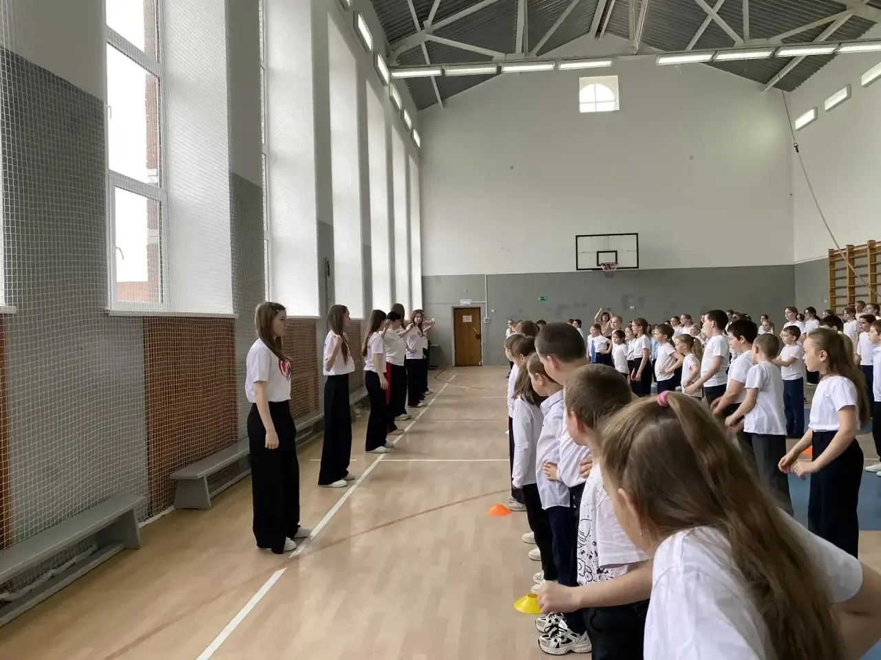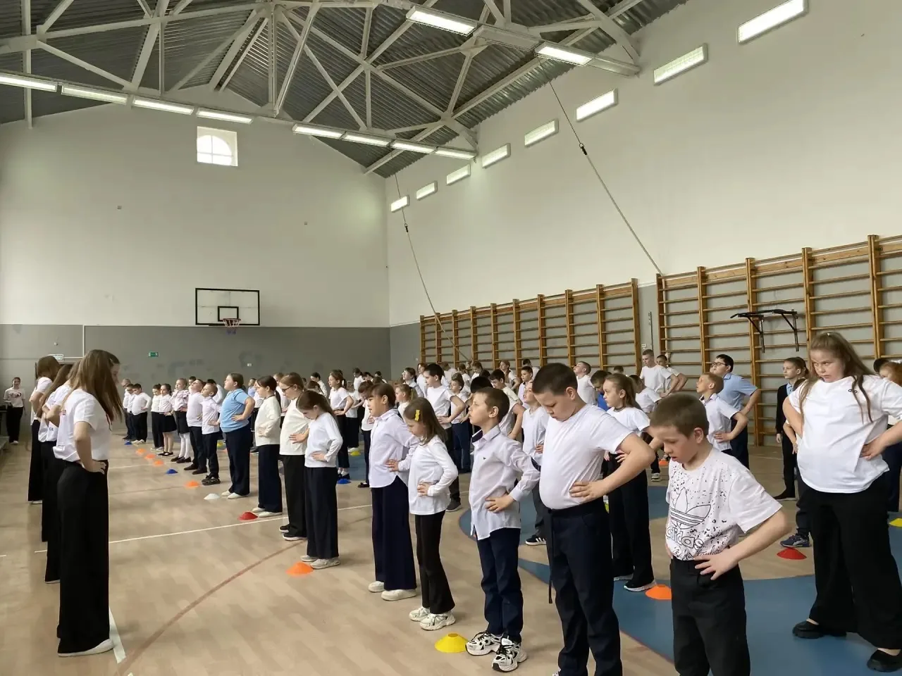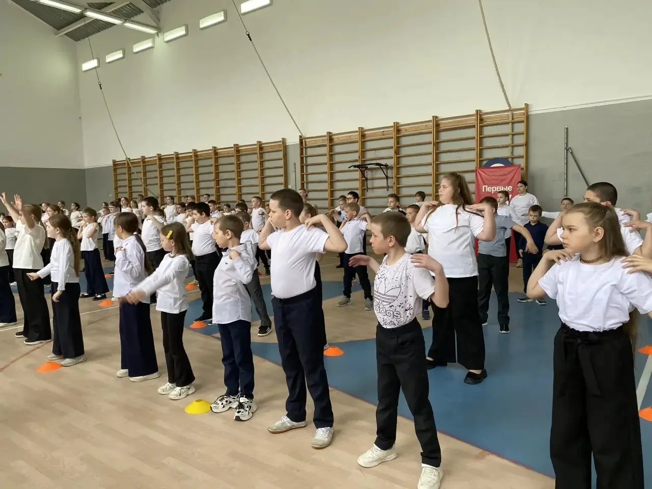 Утро началось с дружной разминки: ученики всех классов вместе с учителями выполнили комплекс динамичных упражнений под зажигательную музыку. Спортивная активность объединила школьников и педагогов — на школьной площадке царили атмосфера радости, позитива и командного духа.