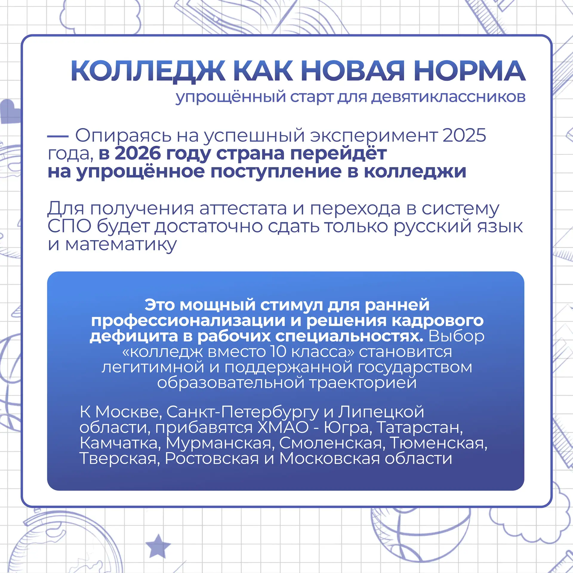 В 2026 году Тюменская область включена в число участников федерального эксперимента. Теперь выпускники девятых классов, планирующие поступать в колледжи и техникумы для получения среднего профессионального образования, вправе сдавать на ОГЭ лишь два экзамена - по русскому языку и математике - вместо четырёх.