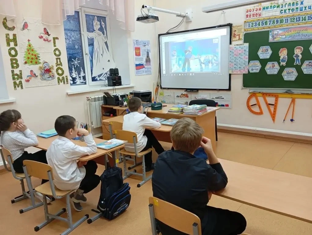 ⚪Сегодня, 12 января, первый учебный день в 2026 году начался с поднятия Флага и исполнения Гимна России, а также внеурочного занятия «Разговоры о важном», которое было посвящено теме «Как создают мультфильмы?».