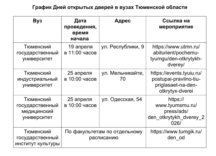 ✅Департамент образования и науки Тюменской области информирует, что в преддверии старта приемной кампании 2026 года образовательные организации высшего образования Тюменской области в апреле текущего года проводят для абитуриентов и их родителей ДНИ ОТКРЫТЫХ ДВЕРЕЙ (график представлен в карточке).
