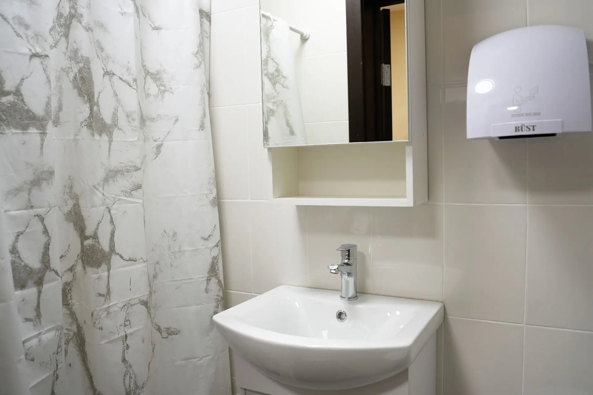 -Уютная ванная комната с новой плиткой и сантехникой.