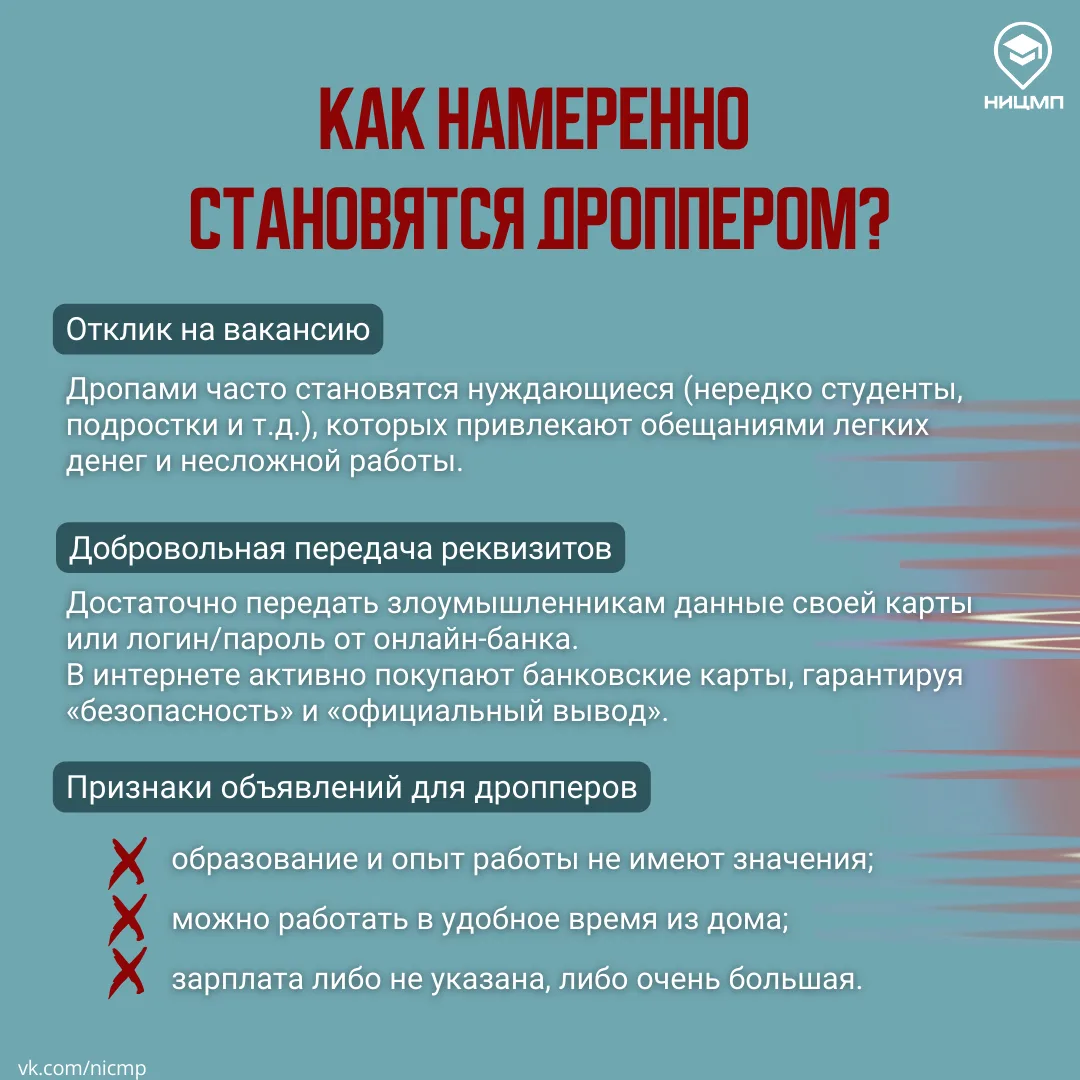 В интернете часто предлагают «легкий заработок»: оформить банковскую карту, передать доступ к счету или провести перевод за вознаграждение. На деле такие предложения могут быть способом вовлечения в преступные финансовые схемы. Стать дроппером можно и случайно, если злоумышленники получат несанкционированный доступ к вашим данным.