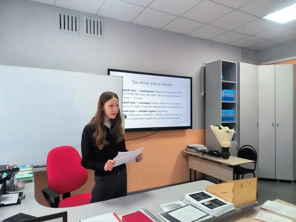 Софья Бородулина представила вниманию класса свой мини-гид по миру цифровых профессий. Ранее Софья провела анкетирование среди одноклассников и выяснила, что многие хотели бы связать свою жизнь с IT, но плохо ориентируются в многообразии специальностей. В своем выступлении «IT-навигатор» она рассказала о профессиях тестировщика, UX/UI-дизайнера и аналитика данных, а также о том, где можно получить соответствующее образование.