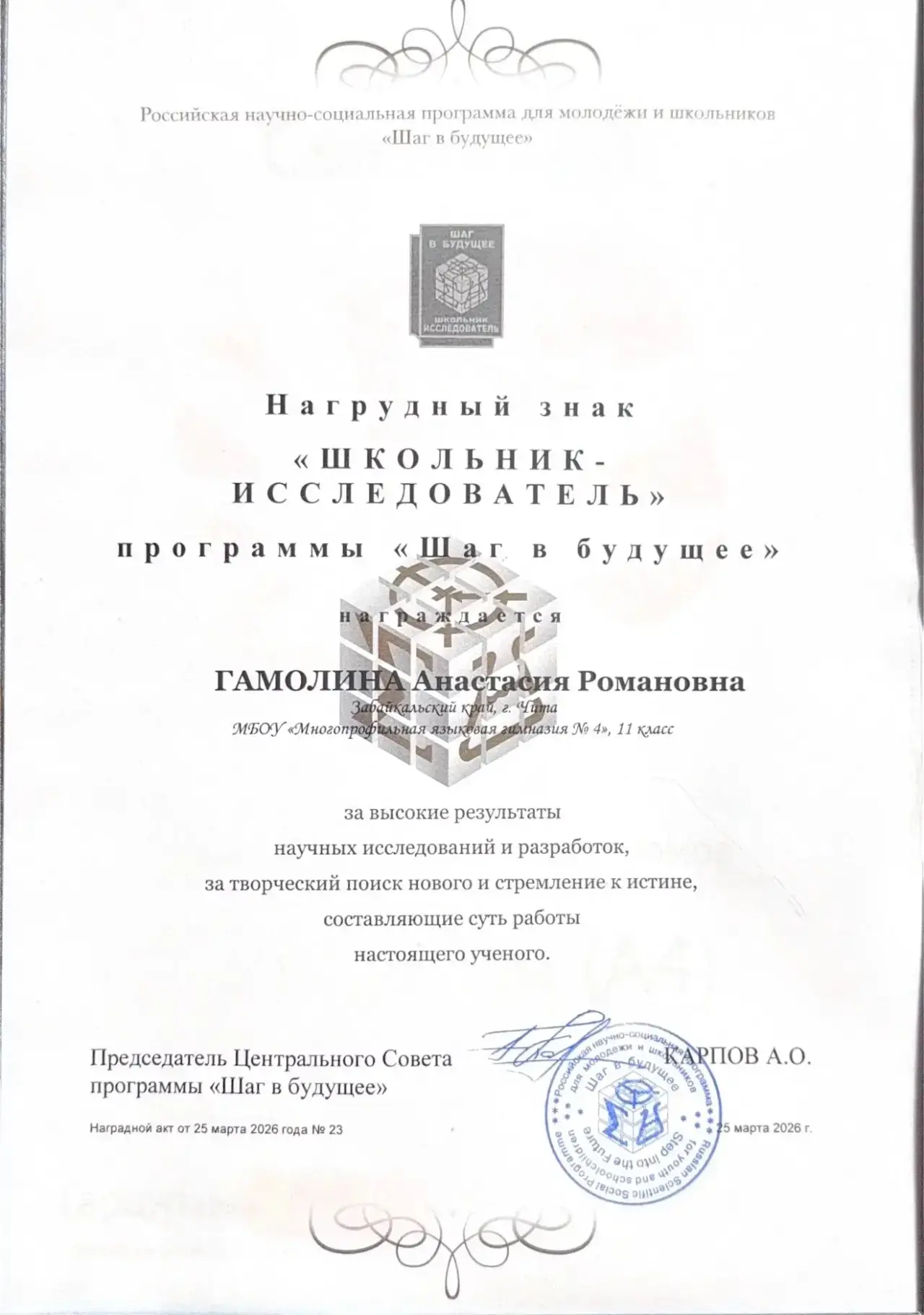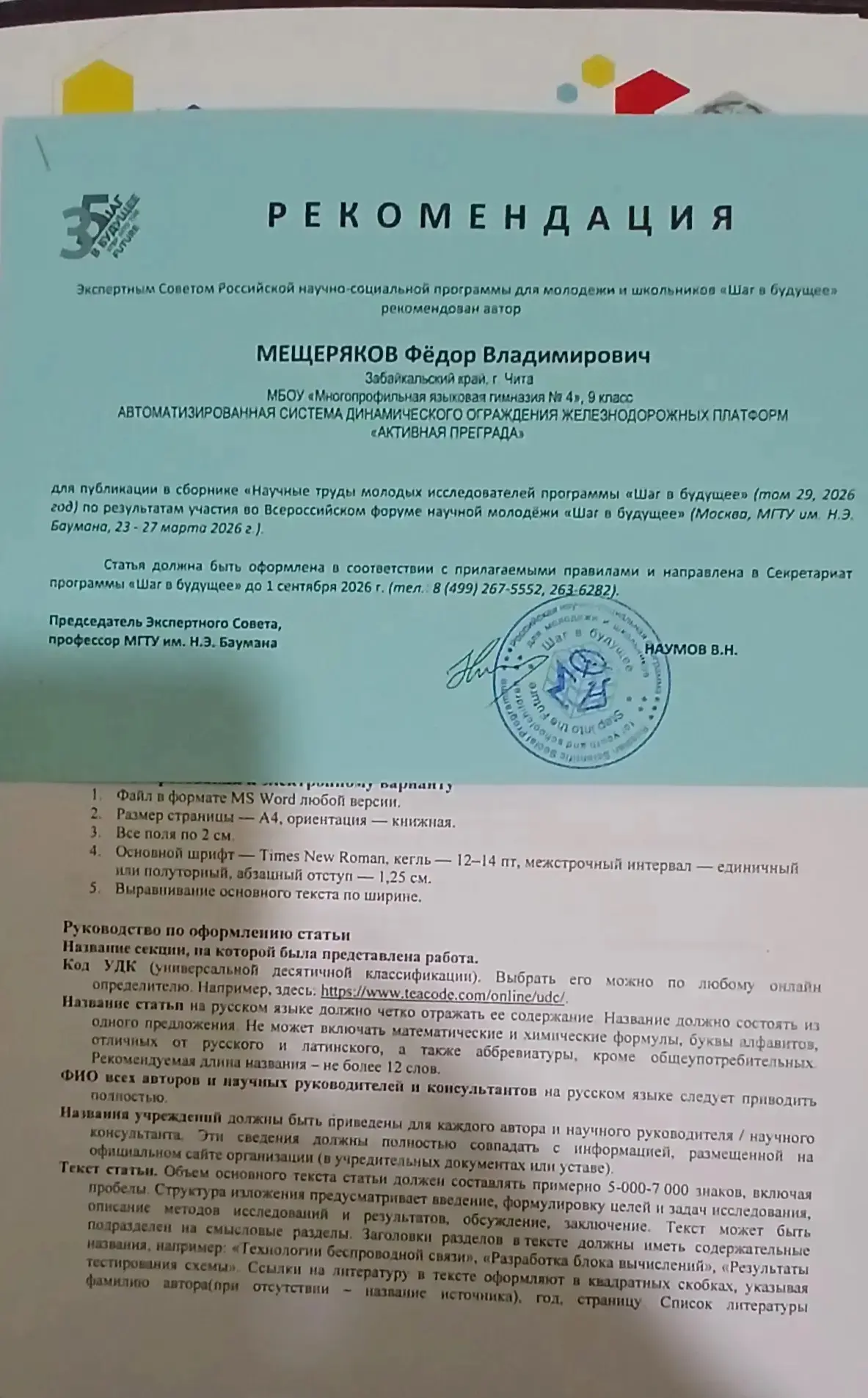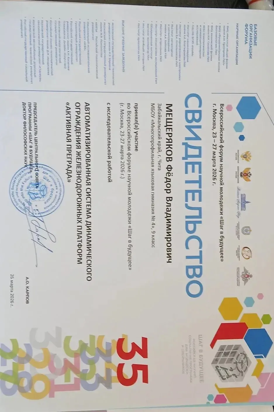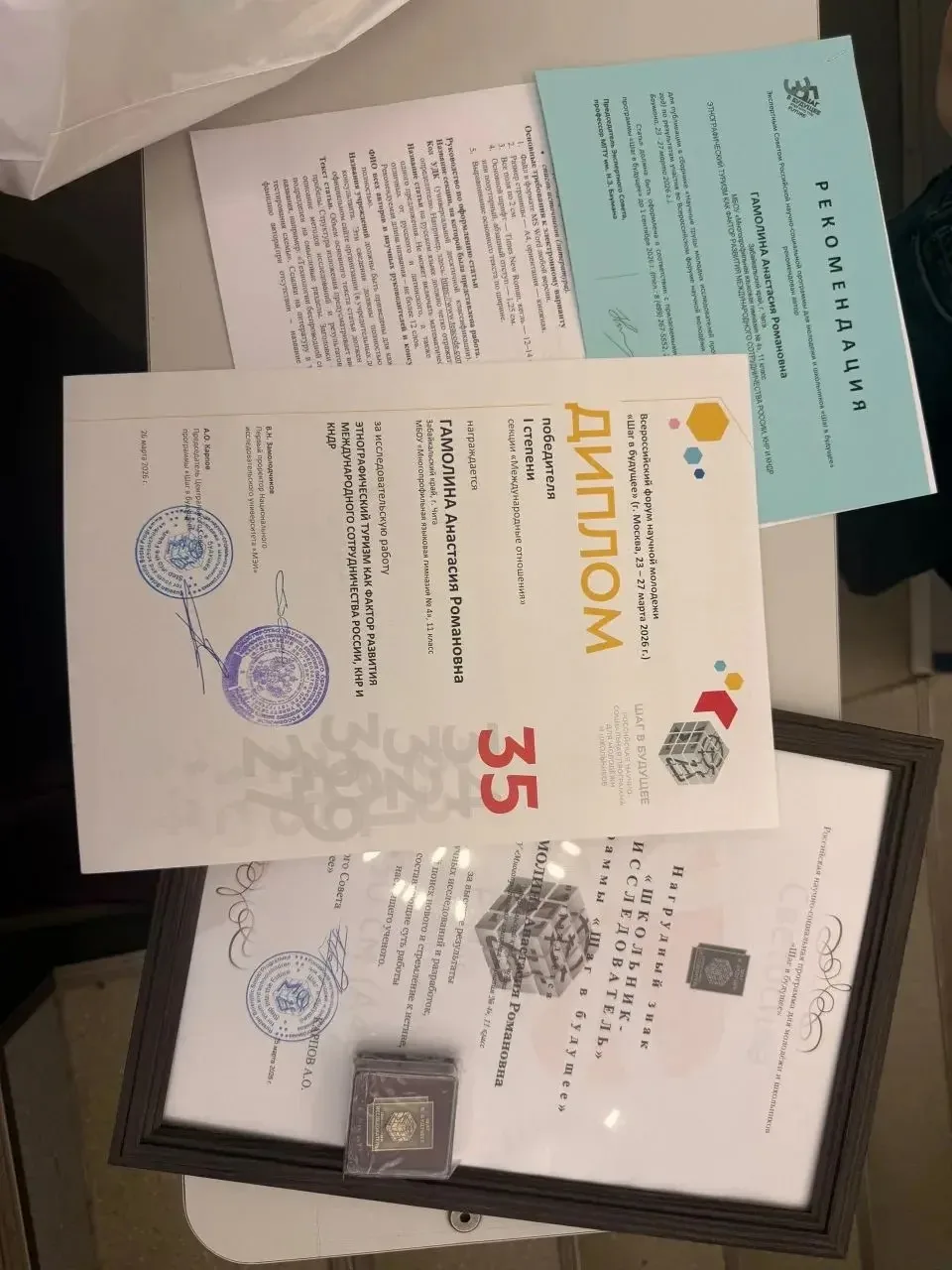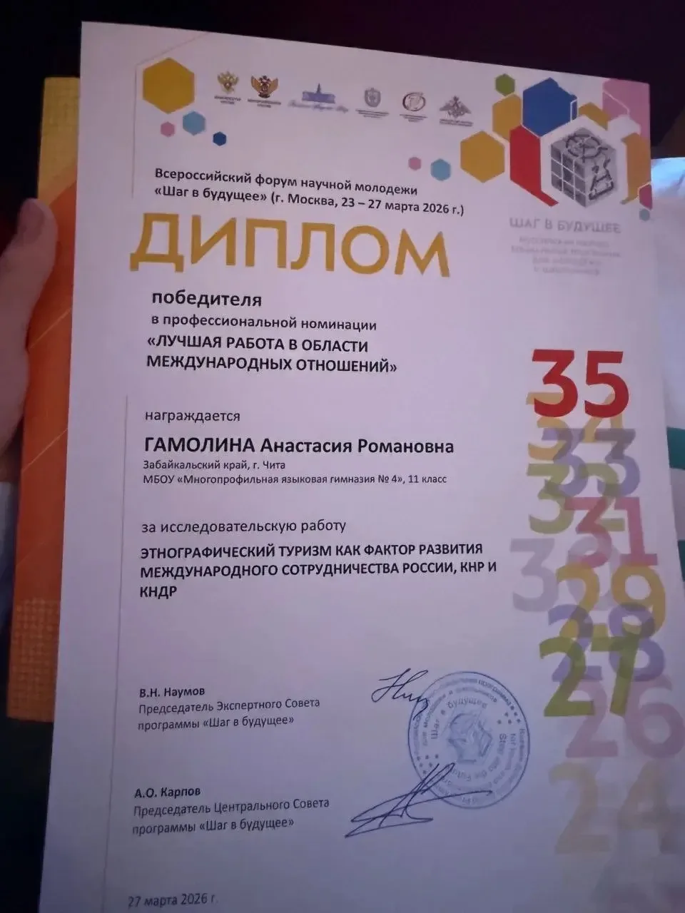 Члены ШНОУ "СИЯР" МБОУ "МЯГ 4" в составе команды Новаторы от Забайкальского края приняли участие в 35 юбилейном Всероссийском форуме научной молодежи "Шаг в будущее", который проходил в г. Москве с 23 по 27 марта. Поздравляем наших ребят с успешным представлением своих научных работ. Гамолина Анастасия - 1 место, награждена нагрудным знаком "Школьник-исследователь", работа рекомендована для публикации в сборнике "Научные труды молодых исследователей программы "Шаг в будущее". Научный руководитель: Портнягина И. Ю. Мещеряков Федор рекомендация к публикации - научный руководитель Портнягина И.Ю. и Шаронова Е. А. Степанова Эвелина номинация " Креативный проект". Кузнецова Анна достойно представила работу в секции химия. Научный руководитель Сурков О.С. Пожелаем нашим молодым ученым успехов.