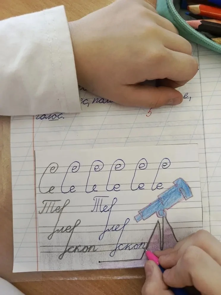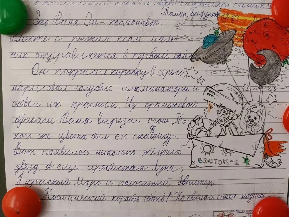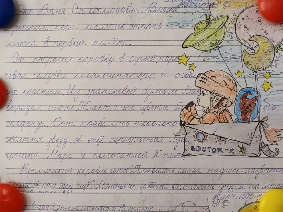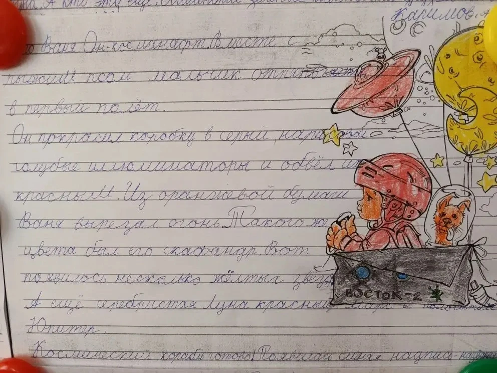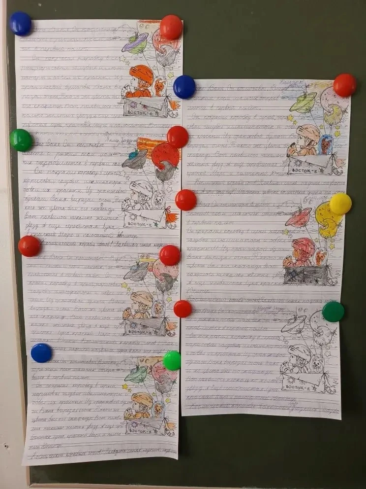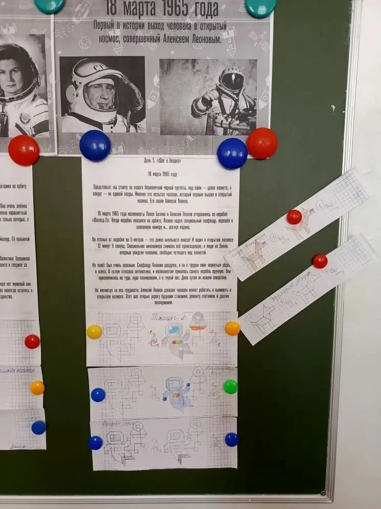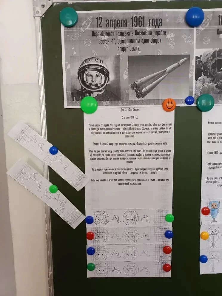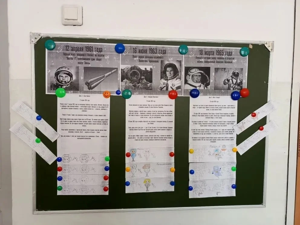 В течение недели на минутках чистописания дети знакомились с важными событиями из истории освоения космического пространства, запоминали даты, фамилии лётчиков-космонавтов, названия оборудования, необходимого для изучения космоса.
