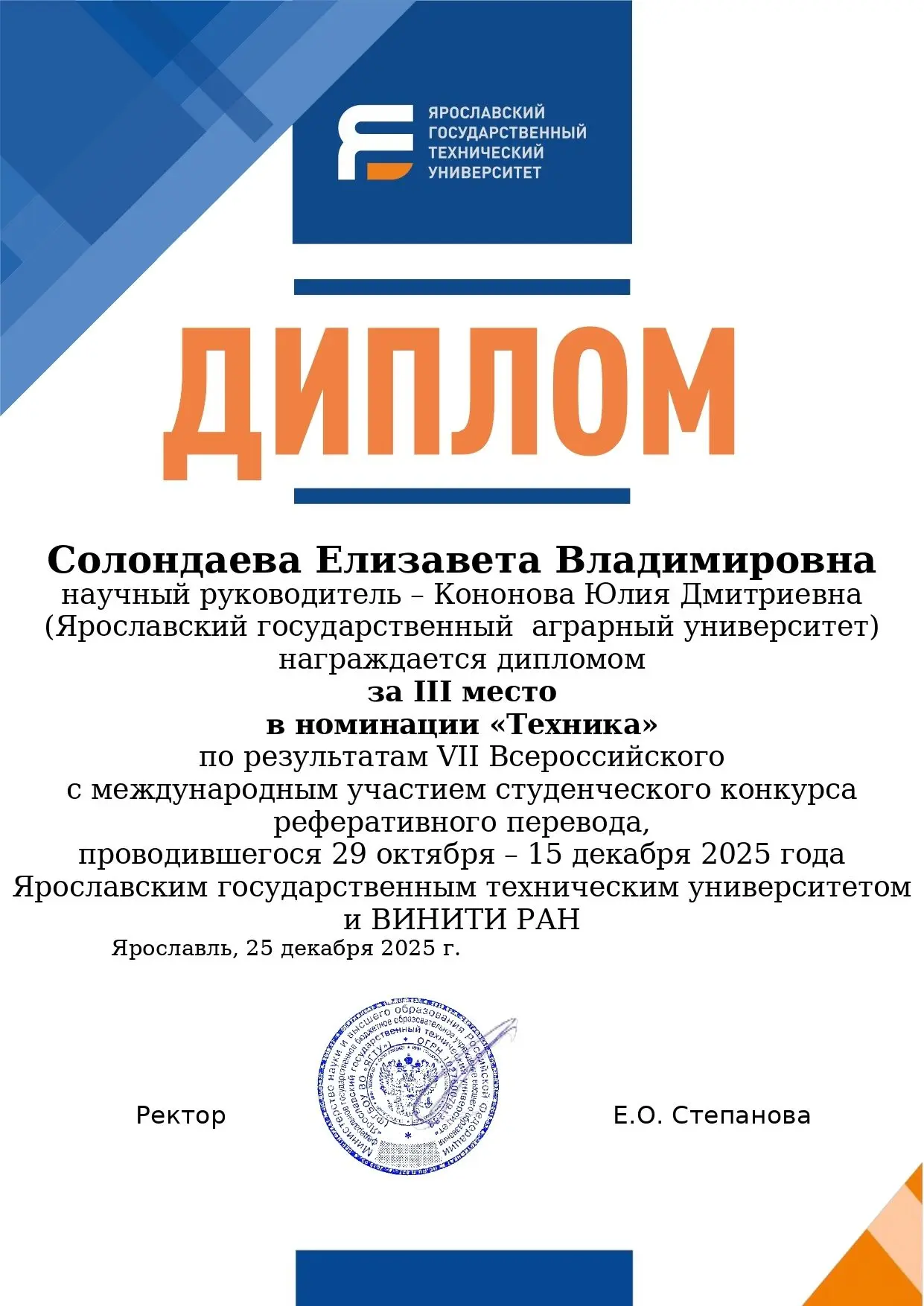 Вдохновляющим завершением прошлого года и началом нового стало призовое место первокурсницы инженерного факультета Елизаветы Солондаевой в VII Всероссийском с международным участием студенческом конкурсе реферативного перевода!