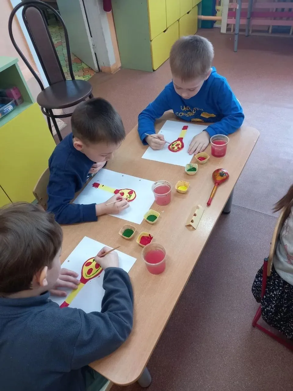 Самым увлекательным стало знакомство с секретами росписи. Как настоящие мастера, дети учились рисовать "полоски", "солнышки" и "елочки" — главные элементы филимоновского узора.