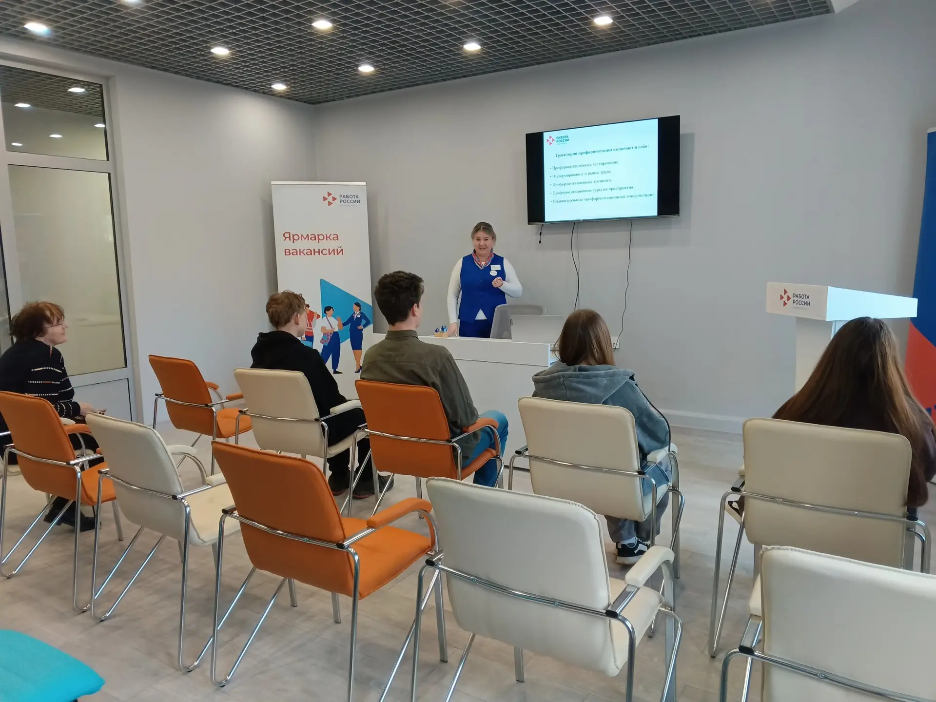 В рамках мероприятия состоялась экскурсия по обновлённому пространству кадрового центра. Консультанты подробно рассказали о направлениях работы центра и о мерах государственной поддержки, которые он предоставляет гражданам.