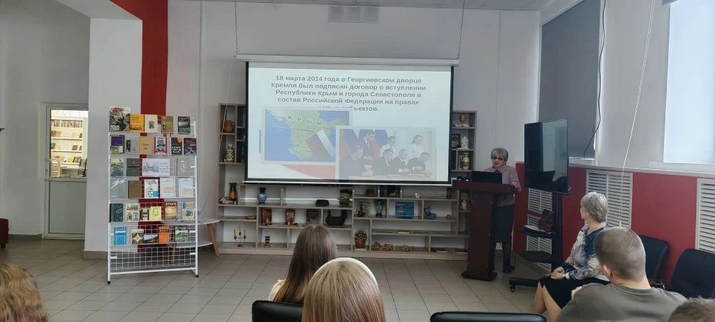 17 марта для учащихся 11 класса ЦО «Средняя школа №3» советником директора по воспитанию Е.С. Филипповой совместно с МБУК УМО «Центр культуры. Муниципальная библиотека» была организована дискуссионная гостиная "Полуостров Крым и город Севастополь", на которой Заслуженный учитель РФ В.Б. Гайнанова рассказала ребятам об истории полуострова Крым.