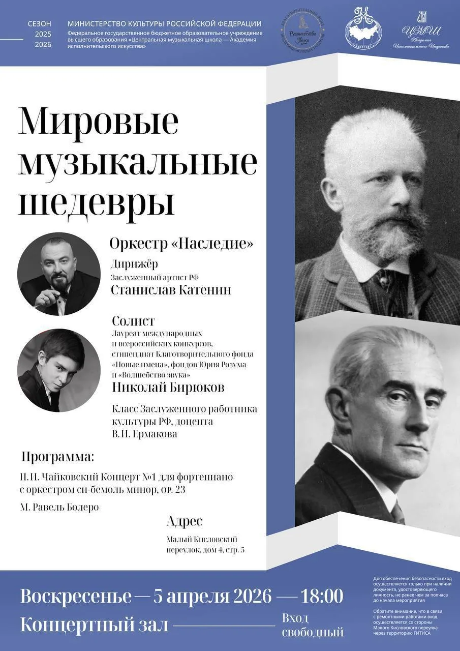 В первом отделении — Концерт для фортепиано с оркестром №1 Петра Ильича Чайковского в исполнении талантливого солиста Николая Бирюкова, лауреата международных конкурсов и учащегося 11 класса (класс Заслуженного работника культуры РФ, доцента В.И. Ермакова) . Во втором отделении симфонический оркестр «Наследие»(художественный руководитель и дирижёр - Станислав Катенин) исполнит легендарное «Болеро» Мориса Равеля.