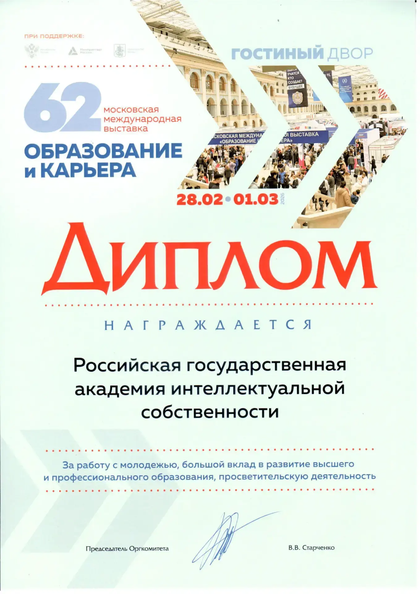 По итогам выставки Российская государственная академия интеллектуальной собственности отмечена дипломом «За работу с молодежью, большой вклад в развитие высшего и профессионального образования, просветительскую деятельность».