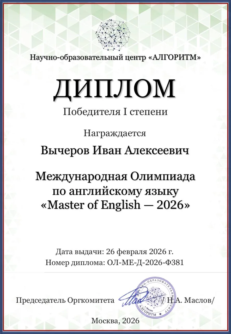 🏅Студент РГАИС – победитель Международной олимпиады по английскому языку «Master of English – 2026»!