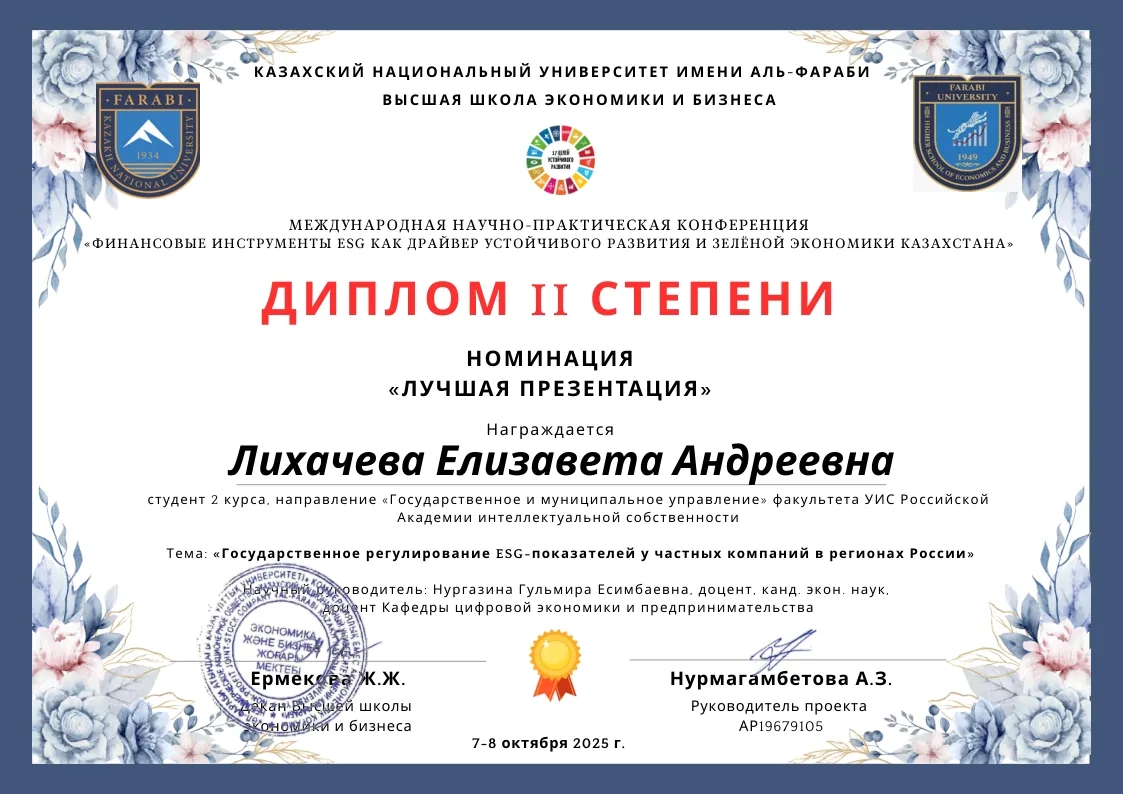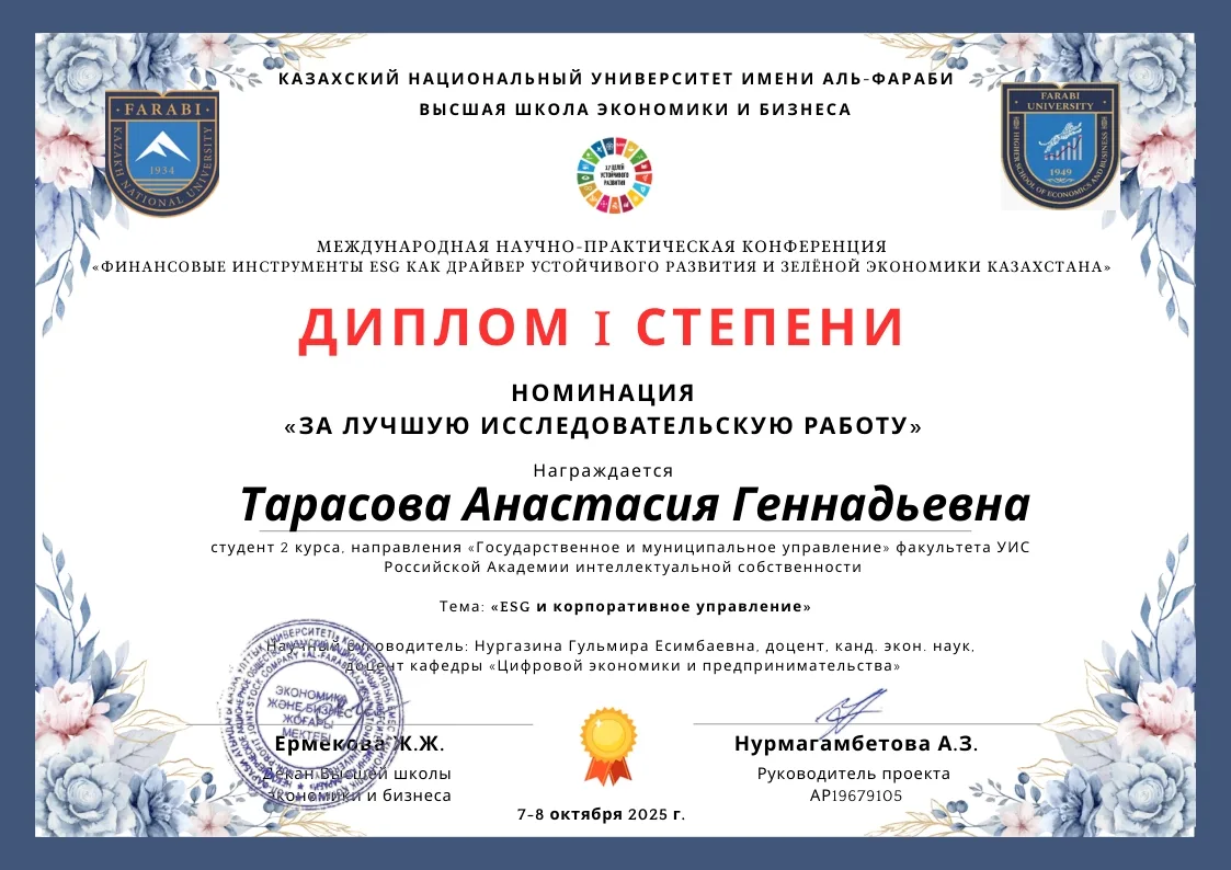 🔹На Международной конференции «Финансовые инструменты ESG как драйвер устойчивого развития зеленой экономики Казахстана» Тарасова Анастасия стала победителем, получив диплом 1 степени за доклад «ESG и корпоративное управление», а Лихачева Елизавета завоевала диплом 2 степени с докладом «Государственное управление ESG показателей у частных показателей в регионах России».