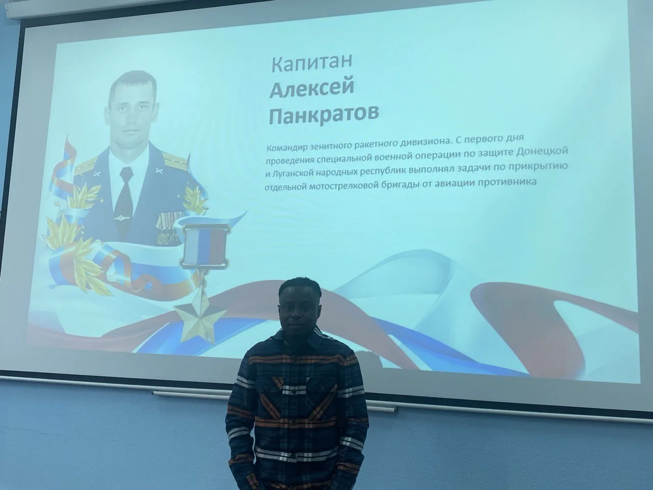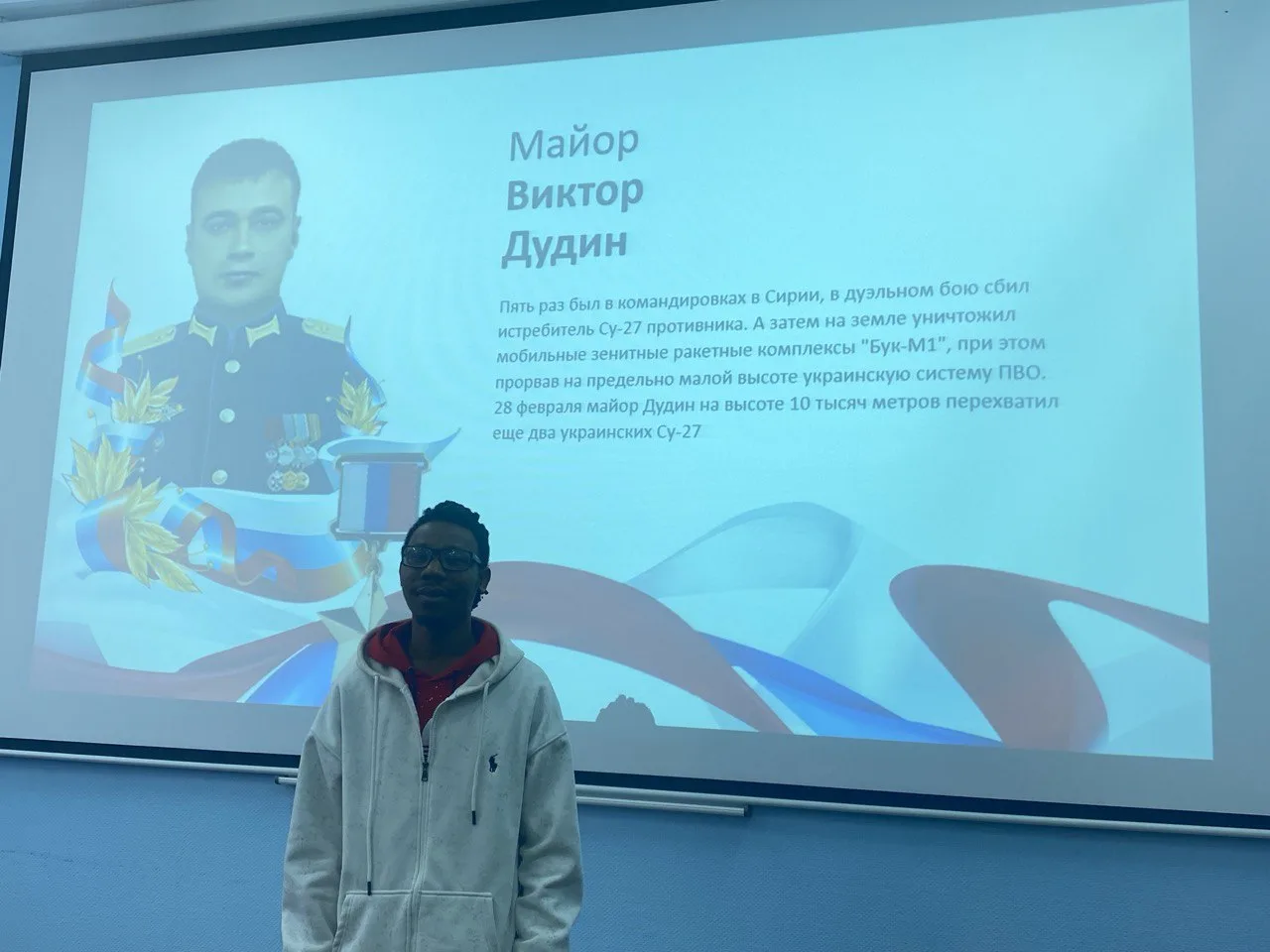 Во время урока иностранные студенты узнали не только о подвигах известных русских воинов, начиная с великих побед Александра Невского и заканчивая современными героями, но и подготовили доклады о Героях СВО, которые сопровождались документальными кадрами и личными воспоминаниями участников военных действий.
