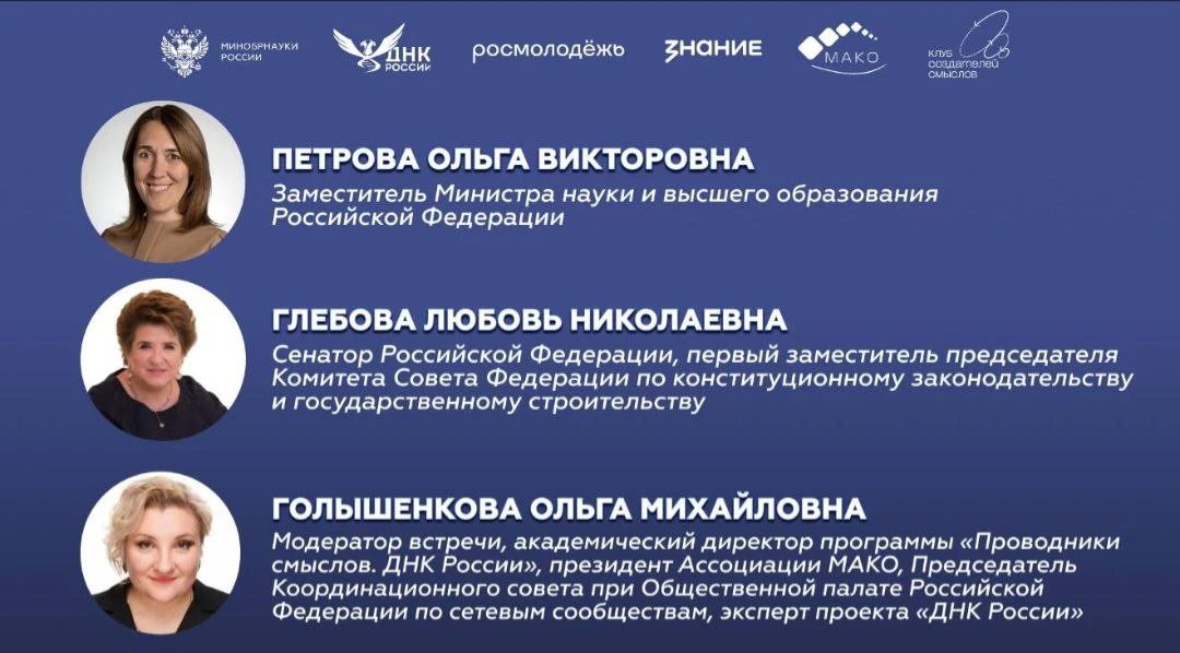 🎙 Спикерами события выступили Петрова О.В. — заместитель Министра науки и высшего образования Российской Федерации, Глебова Л.Н. — первый заместитель председателя Комитета Совета Федерации по конституционному законодательству и государственному строительству, модератором — Голышенкова О.М. — академический директор программы «Проводники смыслов. ДНК России», президент Ассоциации МАКО, председатель Координационного совета при Общественной палате Российской Федерации по сетевым сообществам, эксперт проекта «ДНК России».