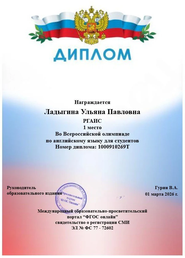 🏅Победа на всероссийском уровне: студентка РГАИС заняла 1 место по английскому языку!