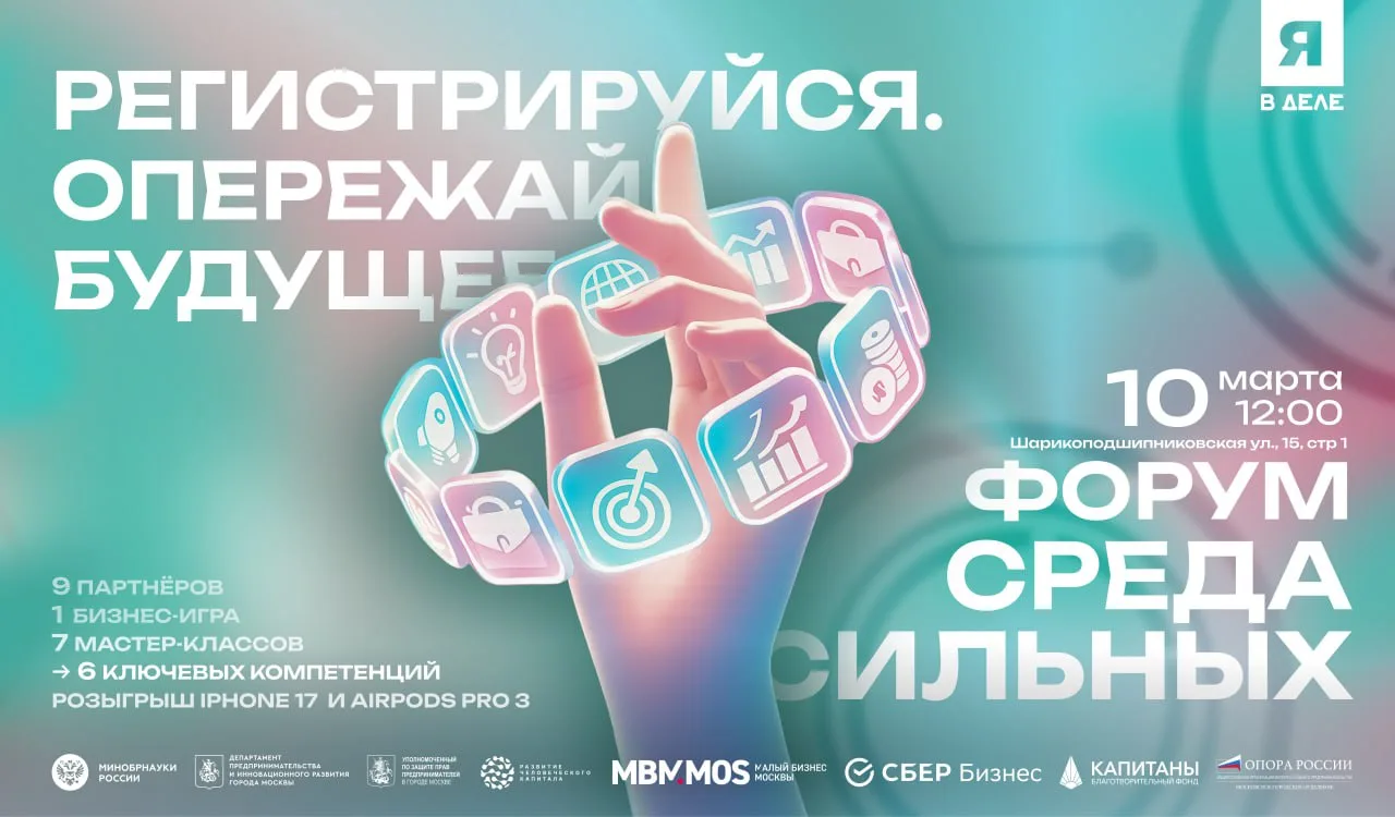 На предпринимательском форуме «Среда сильных» ты сможешь развить 6 ключевых компетенций будущего, которые позволят тебе строить карьеру, запускать проекты и реализовывать собственные идеи!