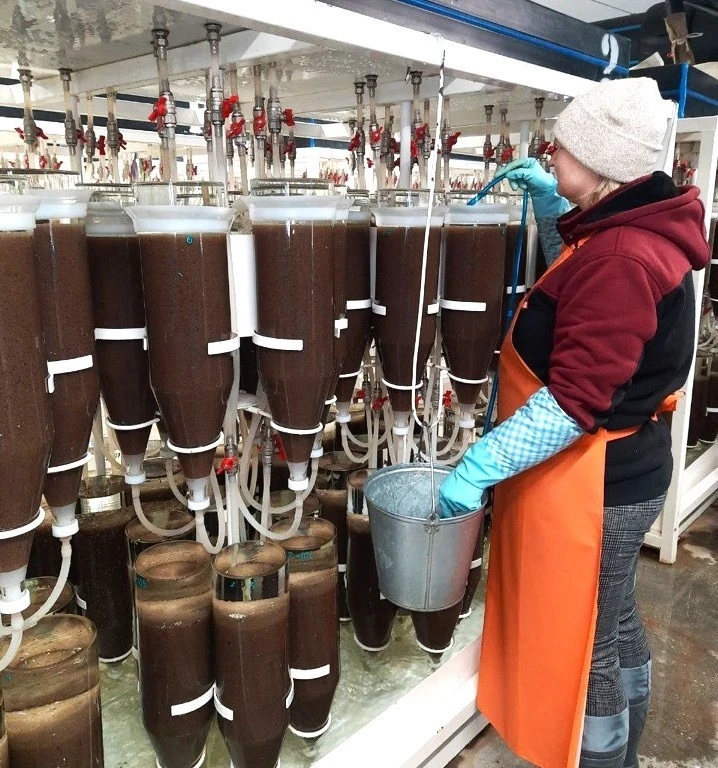 Система замкнутого водоснабжения позволяет использовать воду многократно. Механическая фильтрация очищает её от корма и взвесей, а биофильтры перерабатывают аммиак и нитриты. В результате в бассейнах поддерживается стабильная и безопасная среда, а сама рыба круглый год находится в условиях естественной температуры воды. Это снижает нагрузку на природные ресурсы и делает завод независимым от внешних факторов.