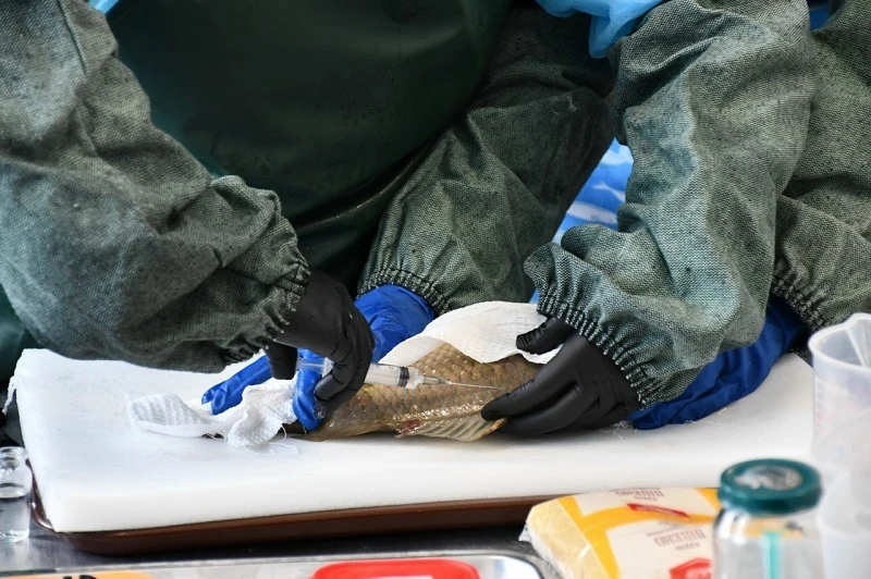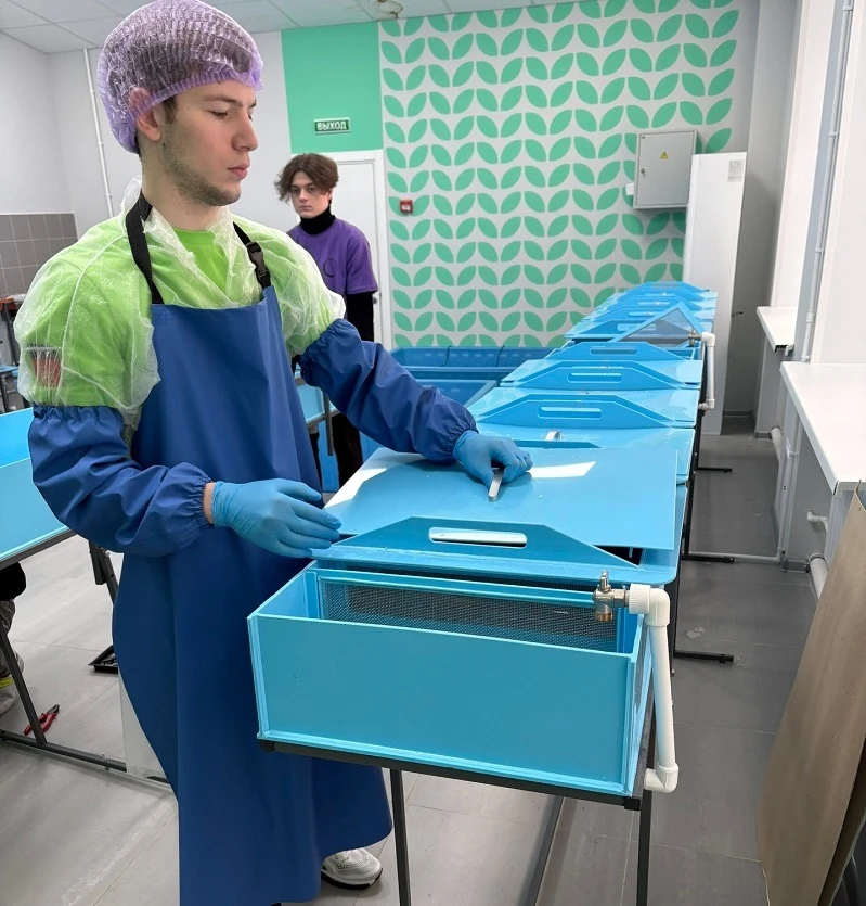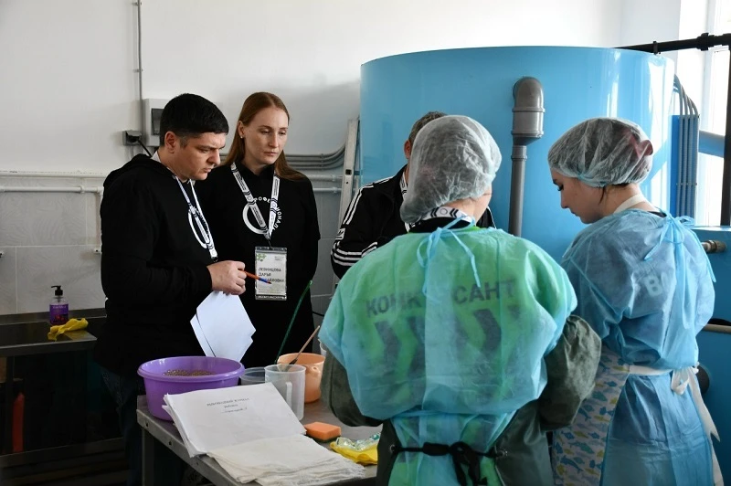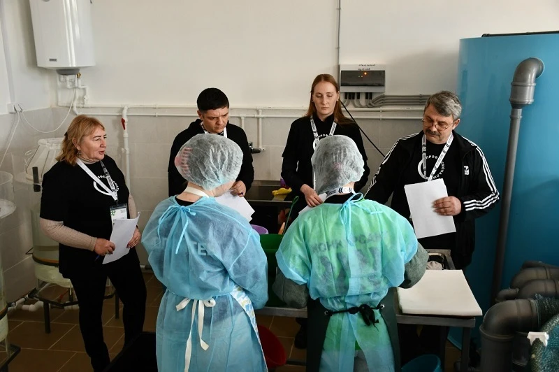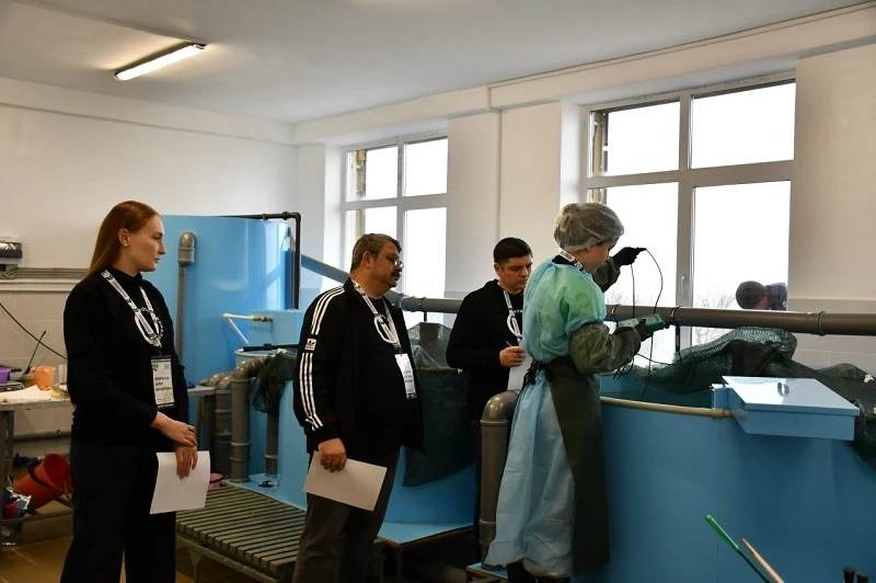 Компетенция «Выращивание рыбопосадочного материала и товарной рыбы»: студенты показывают навыки в расчёте количества комбикорма, имитации отцеживания икры, осеменении, лечебной обработке рыбы, проверке качества икры, работе с бинокуляром, нитратомером и другими инструментами.