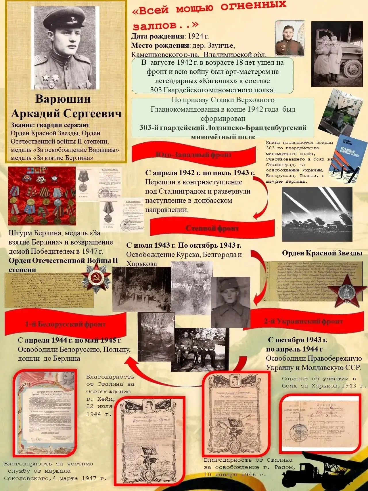 Его работа, выполненная совместно с мамой, посвящена боевому пути прадедушки, который пошёл на фронт в 18 лет и дошёл до Берлина. Тимофей и его мама самостоятельно восстановили маршрут прадеда, изучали архивные документы, нашли подтверждение его наград и составили подробную хронологию событий.