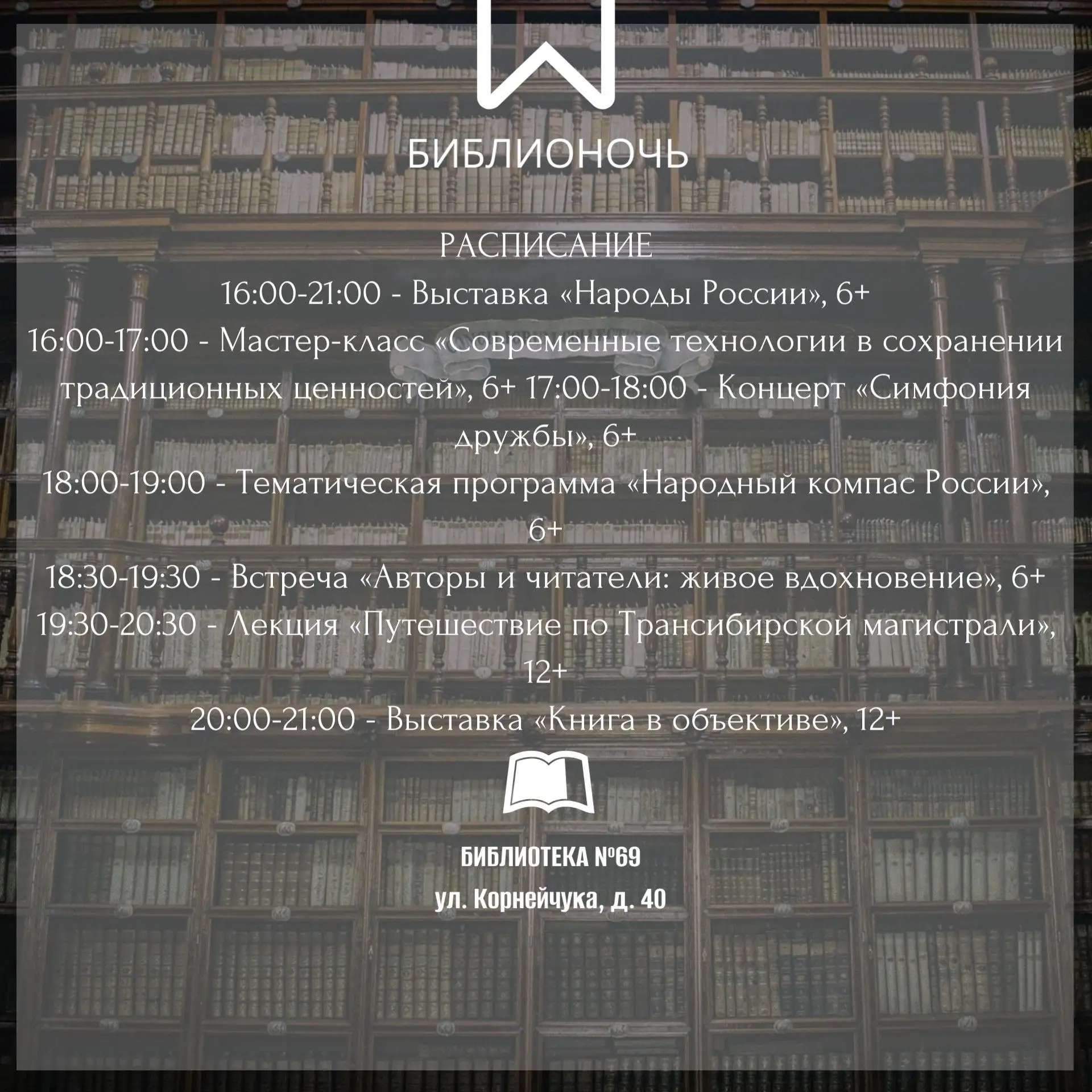 20:00 - выставка «Книга в объективе». Представляем выставку лучших снимков, где главным героем стала книга.
