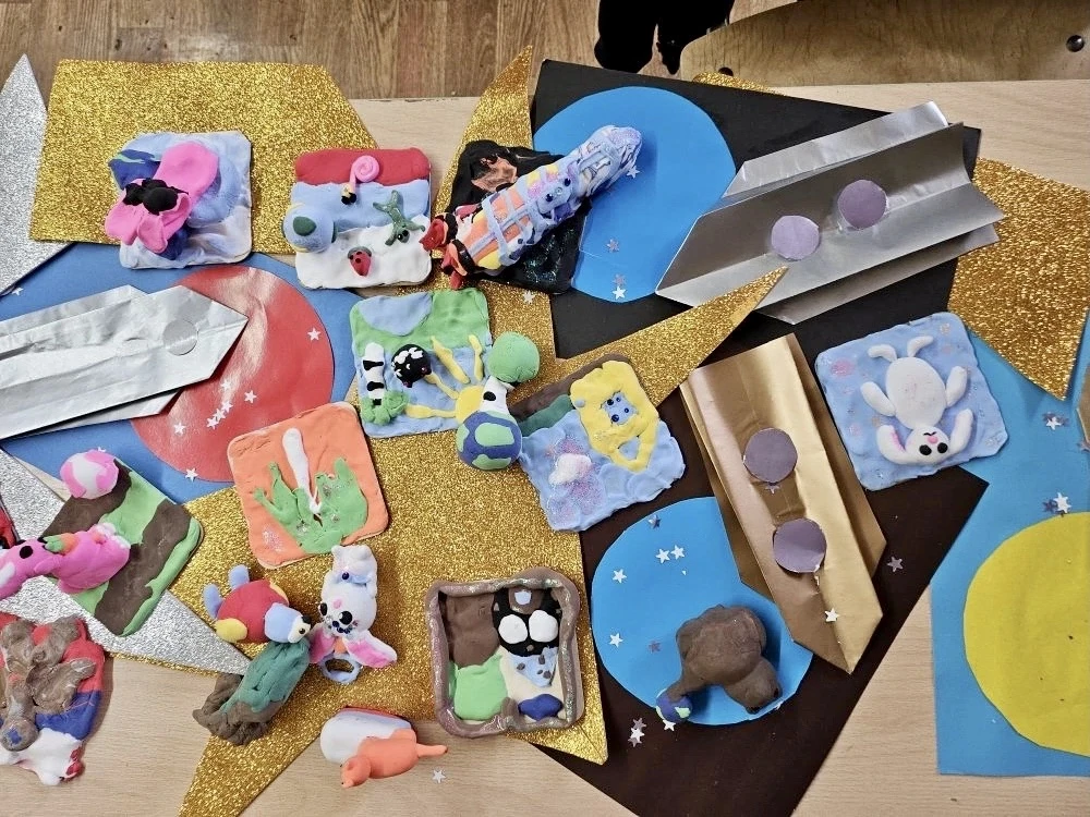 🌞 Младшие группы отправились в путешествие по Солнечной системе: танцевали под «звёздным небом», собирали «космический корабль» в эстафетах, знакомились с планетами и даже пробовали сочинять первые стихи о космосе.