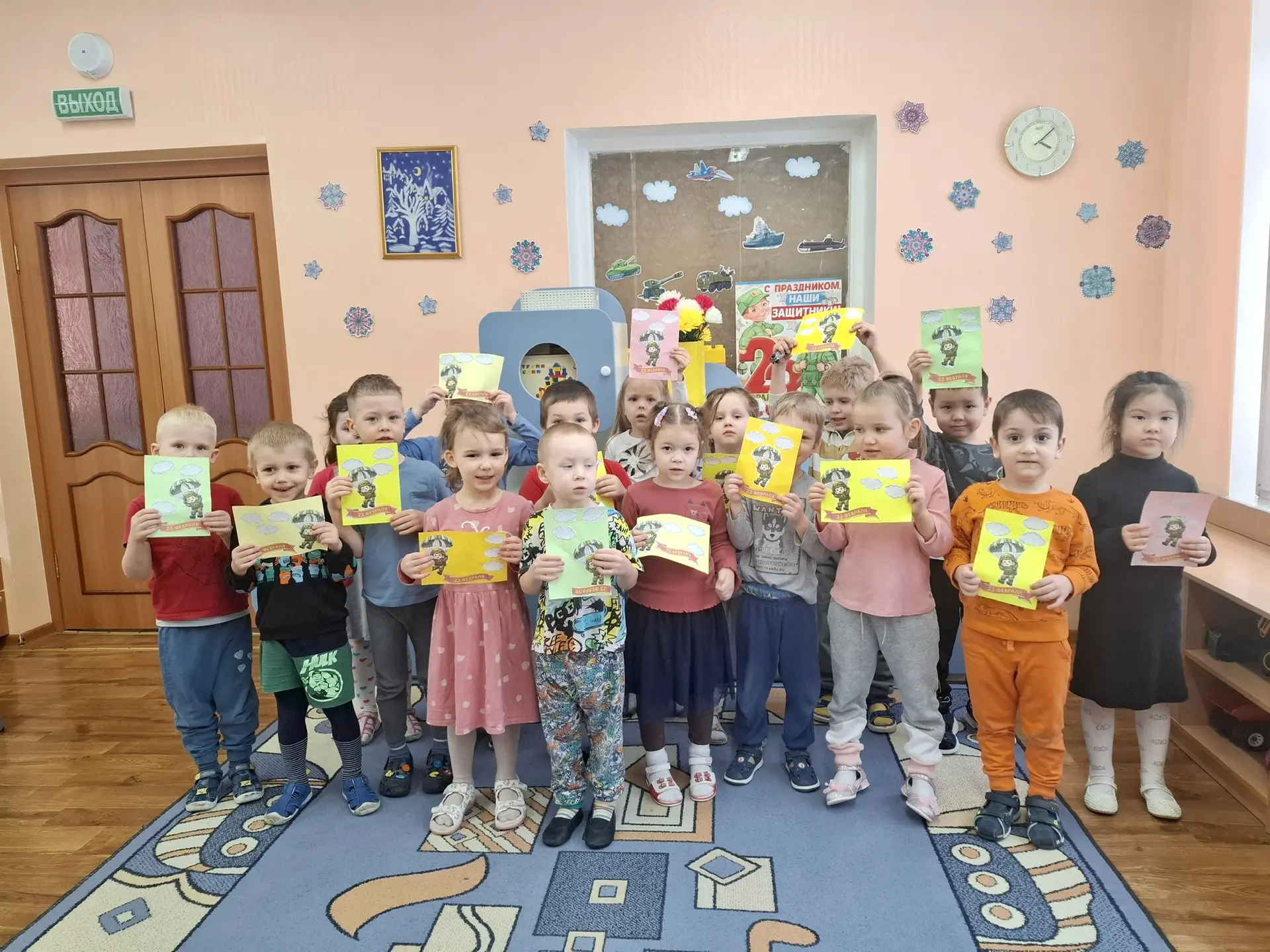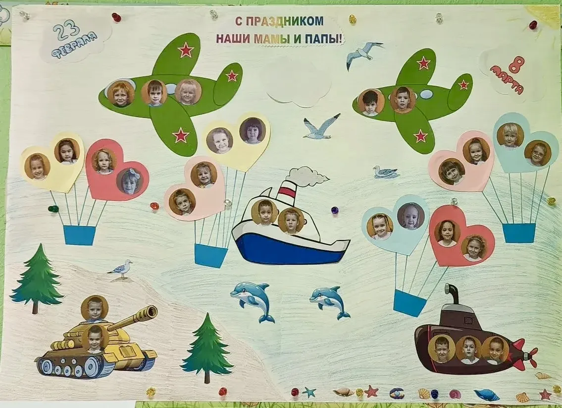 🔹В средней группе 2А корпуса 8 (ул.Бестужевых, 8Д) дети объединили сразу два праздника — 23 февраля и 8 марта — в одном большом коллективном плакате. На нём «взлетели» самолёты и «поплыли» корабли — символы папиной силы, а рядом «расцвели» облака и воздушные шары — символы маминой нежности.