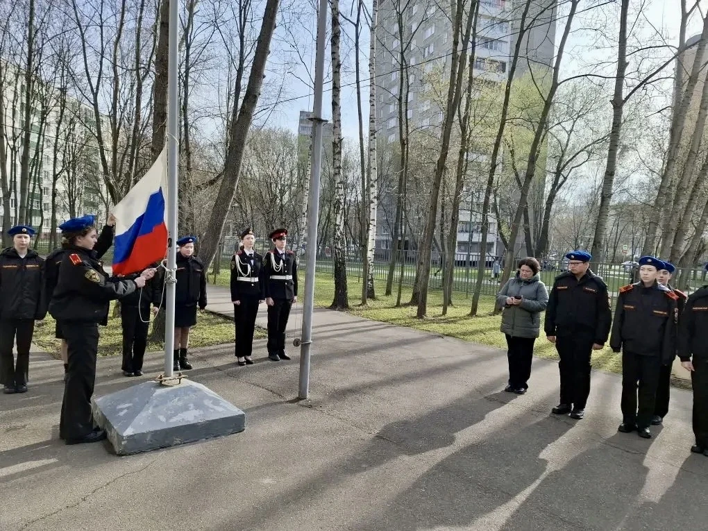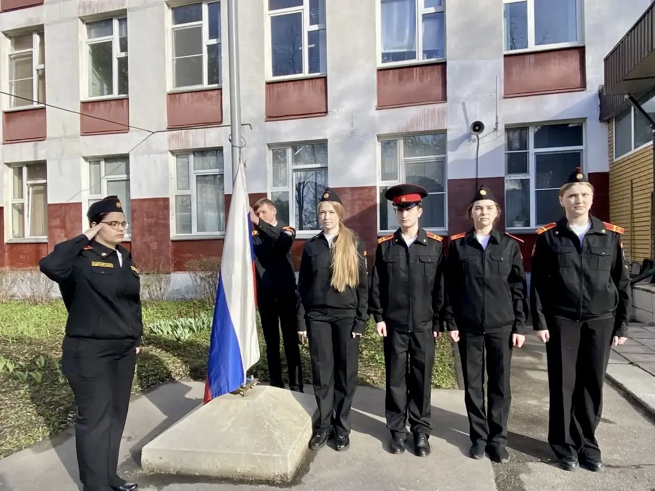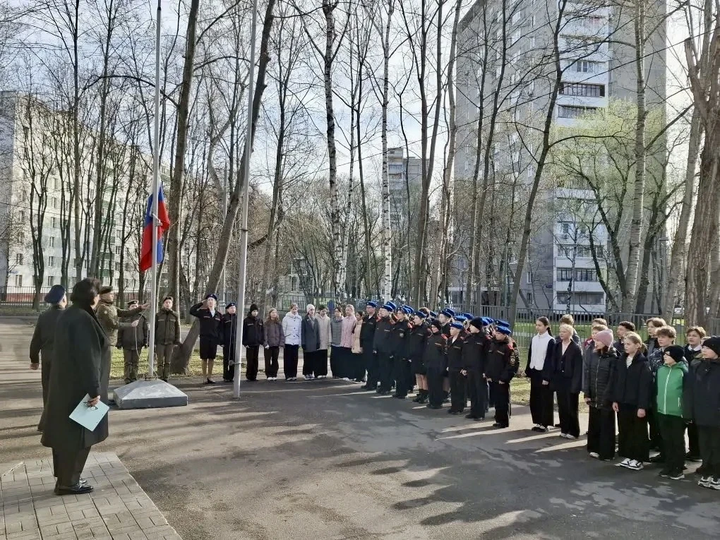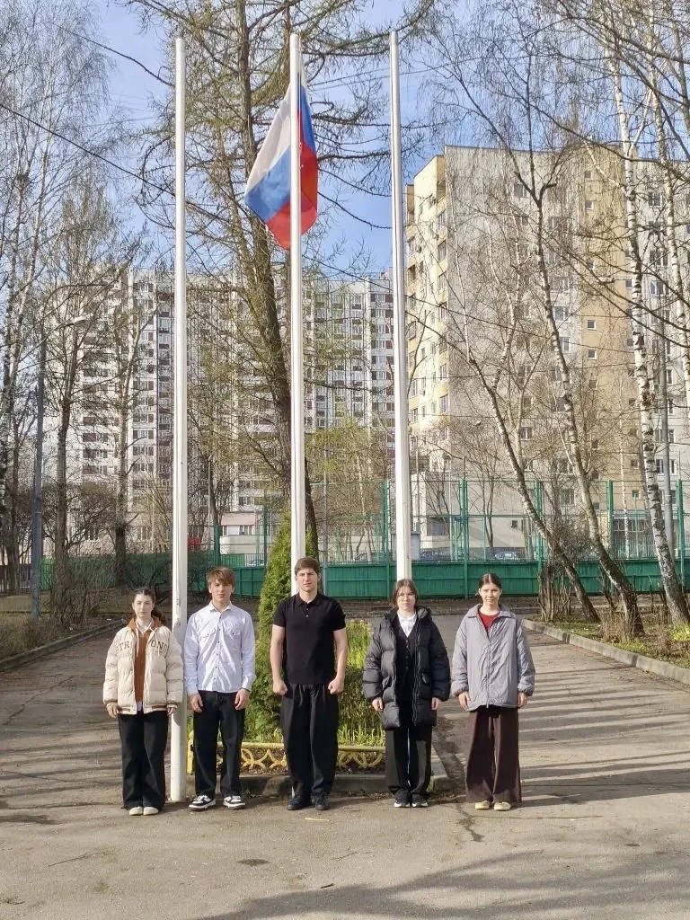 -ученики 7-х классов: Невелева Майя, Тимофеев Михаил, Казакаев Мурат, Михайлов Богдан, почётное право устанавливать флаг было предоставлено ученицам 7г класса — Невелевой Майе, Грицай Екатерине — за активное участие в школьных мероприятиях и городских конкурсах.