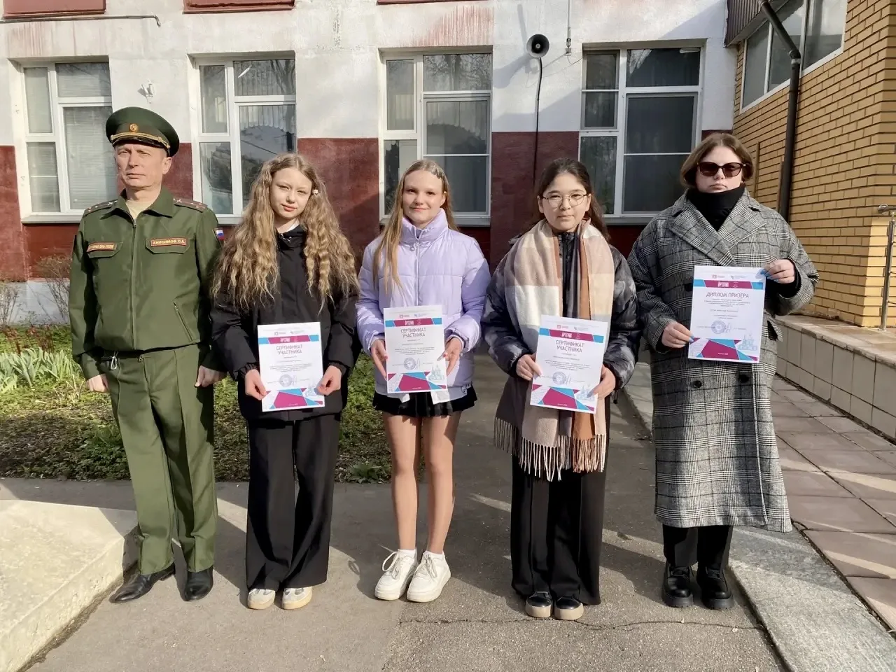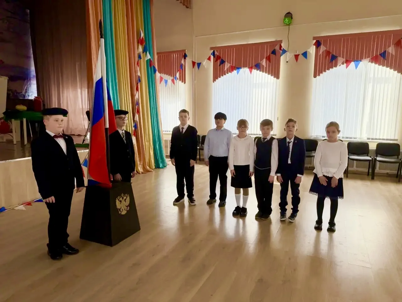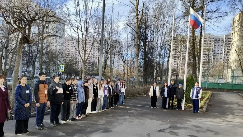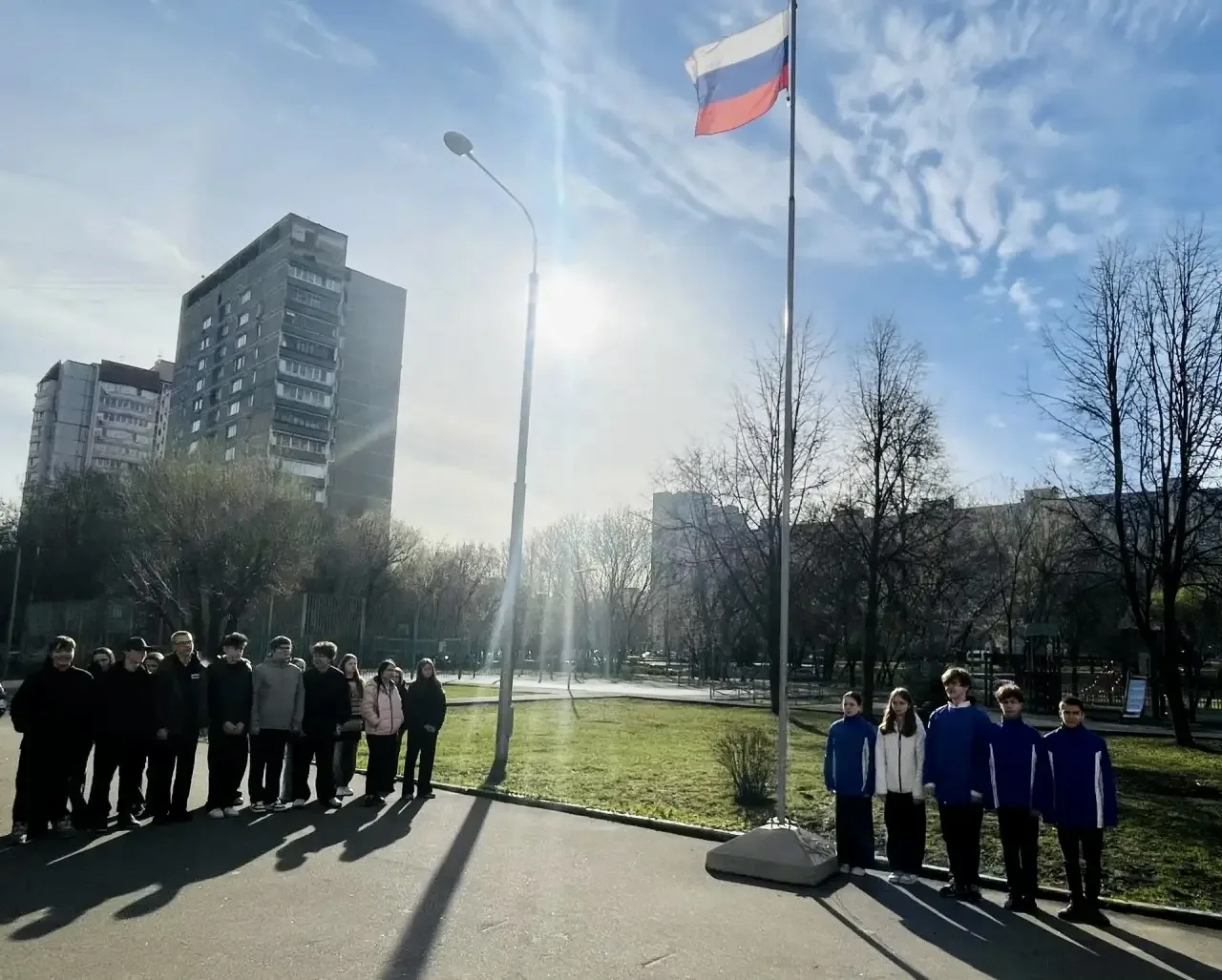 -ученики 7-х классов: Невелева Майя, Тимофеев Михаил, Казакаев Мурат, Михайлов Богдан, почётное право устанавливать флаг было предоставлено ученицам 7г класса — Невелевой Майе, Грицай Екатерине — за активное участие в школьных мероприятиях и городских конкурсах.