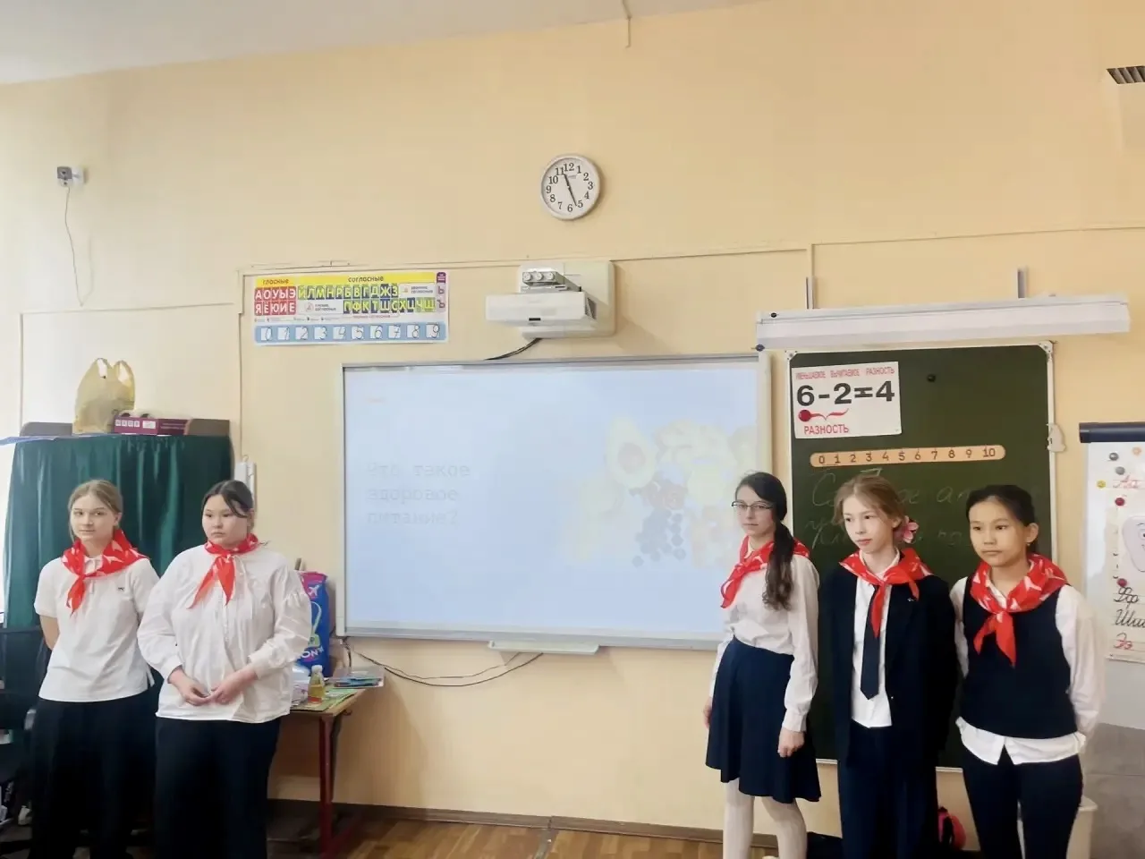 🎯Ученики с удовольствием выполняли задания, которые для них подготовили активисты Движения Первых: отгадывали загадки про предметы гигиены, участвовали в игре «Правильно — неправильно»: показывали жестами, согласны ли с утверждением (например, «Мыть руки нужно только после прогулки»); эстафета «Собери полезные привычки», весёлая зарядка, «Правильное питание» — раскладывали карточки с изображениями продуктов по трём группам (зелёный — можно часто, жёлтый — иногда, красный — редко); задание «Составь меню»: из предложенных картинок выбирали блюда для завтрака, обеда и ужина; создали своими руками Дерево полезных привычек.