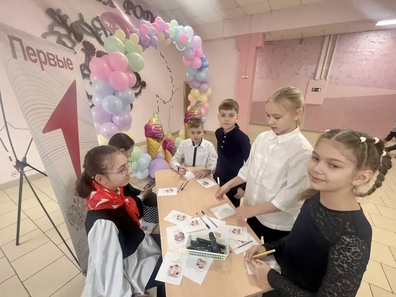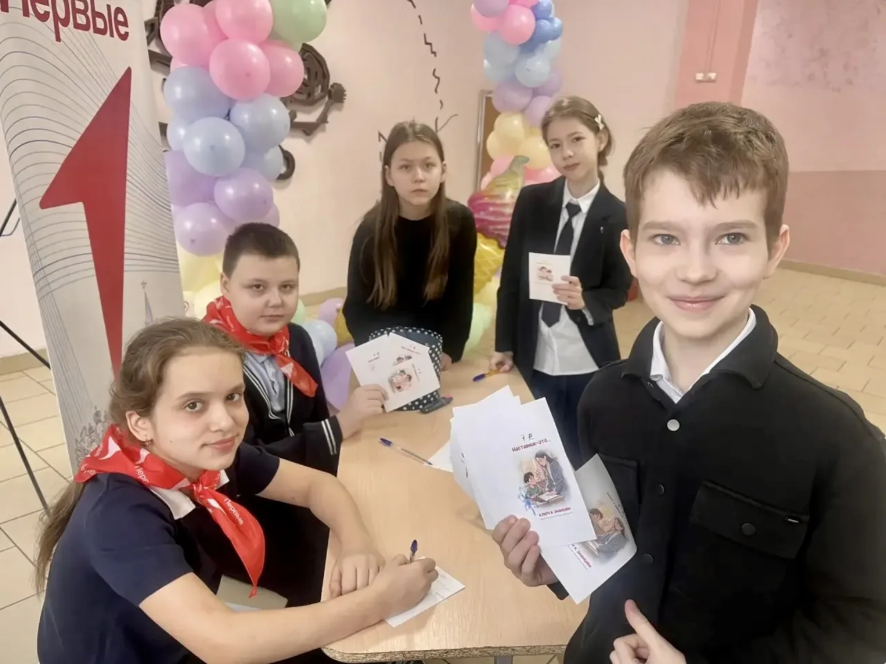 😊С самого утра на первом этаже царила атмосфера праздника: ребята вручали открытки педагогам-наставникам, классным руководителям, старшим товарищам. Дети кратко рассказывали, за что именно они благодарят наставника (например: «Спасибо, что помогли мне подготовиться к олимпиаде», «Вы научили меня не бояться выступать перед классом»).