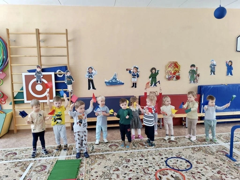 А в ясельной группе 1А-Я прошла тематическая неделя: малыши знакомились с военными профессиями, рассматривали танки, корабли и самолёты, маршировали с флажками и в творческой мастерской сделали трогательные подарки — кружки для пап и дедушек.