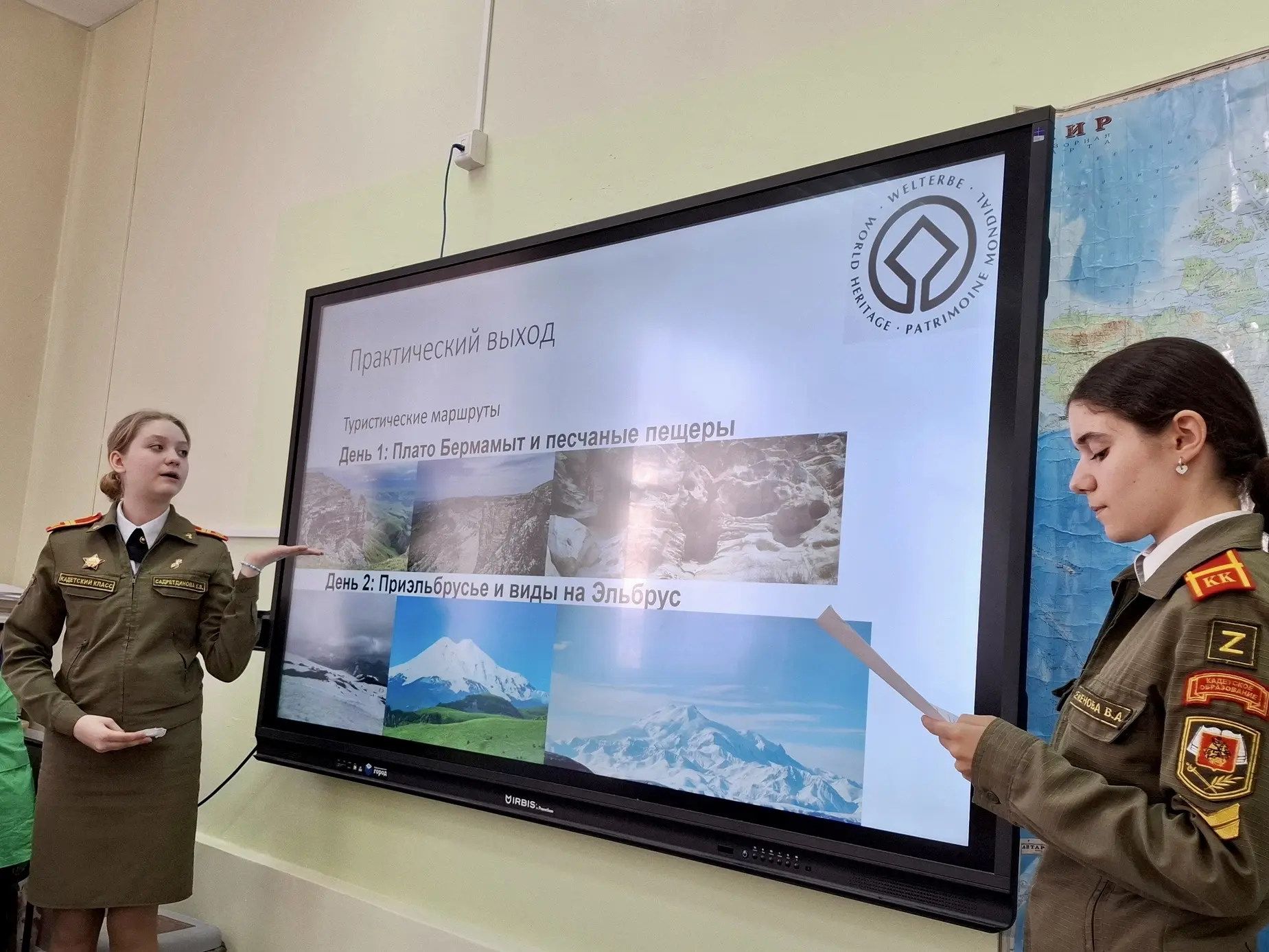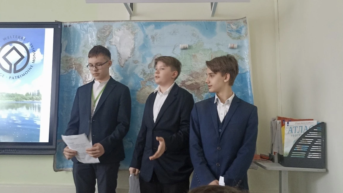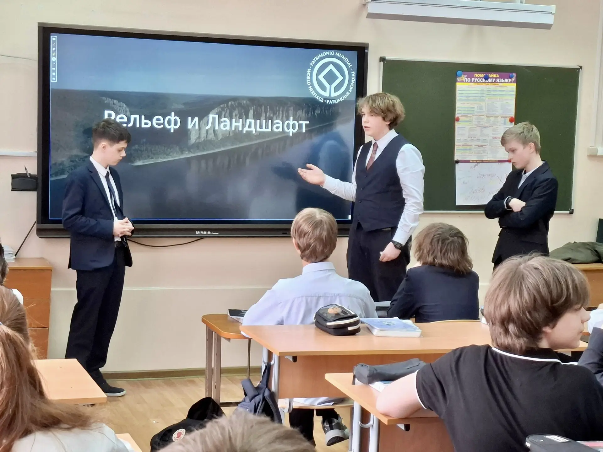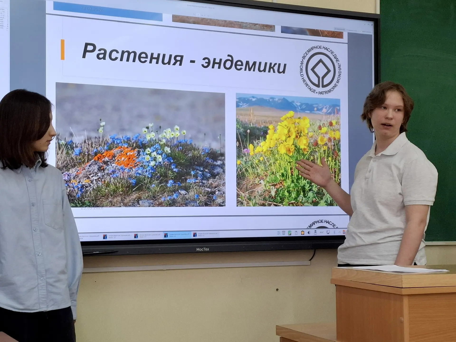 🗺️ Проектные группы изучали материалы про объекты Всемирного природного наследия России: «Девственные леса Коми», «Озеро Байкал», «Вулканы Камчатки», «Золотые горы Алтая», «Западный Кавказ», «Центральный Сихотэ-Алинь», «Остров Врангеля», «Плато Путорана», «Ленские столбы», «Ландшафты Даурии». Ребята исследовали географическое положение, рельеф, климат, ландшафт, реки и озёра, водопады, разнообразие органического мира, традиции коренных народов, причины создания заповедников, проводимую научную и селекционную работу (научный руководитель - учитель географии Е. Г. Хохлова).