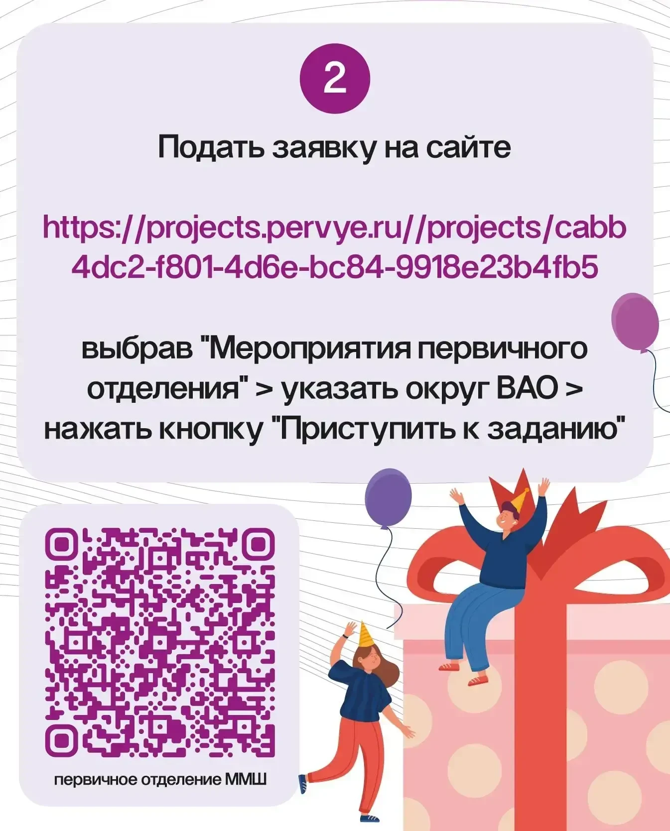 1) Зайди на сайт Движения Первых и выбери "Мероприятия первичного отделения" > укажи округ ВАО > нажми кнопку "Приступить к заданию": https://clck.ru/3S79ee