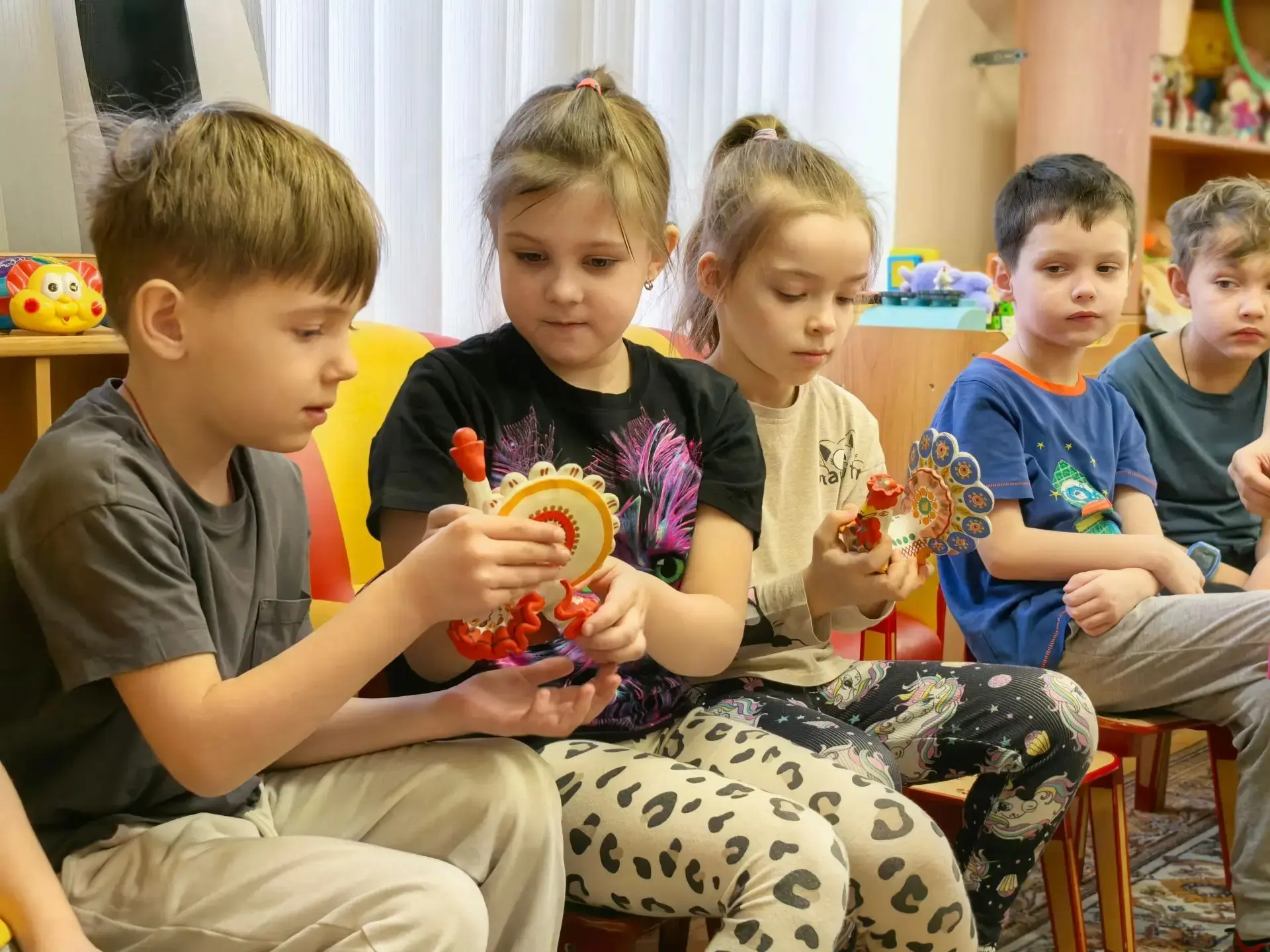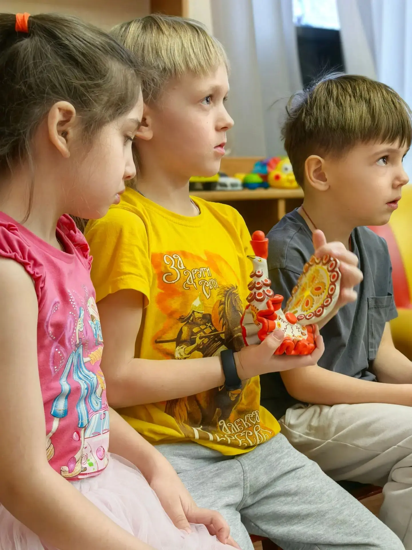 ⭐В гости в дошкольную группу пришла не просто игрушка, а целая история! Воспитатель рассказала об отличительных особенностях дымковской росписи: почему мастера используют красный, желтый, синий и зеленый цвета, и что означают простые на первый взгляд узоры.