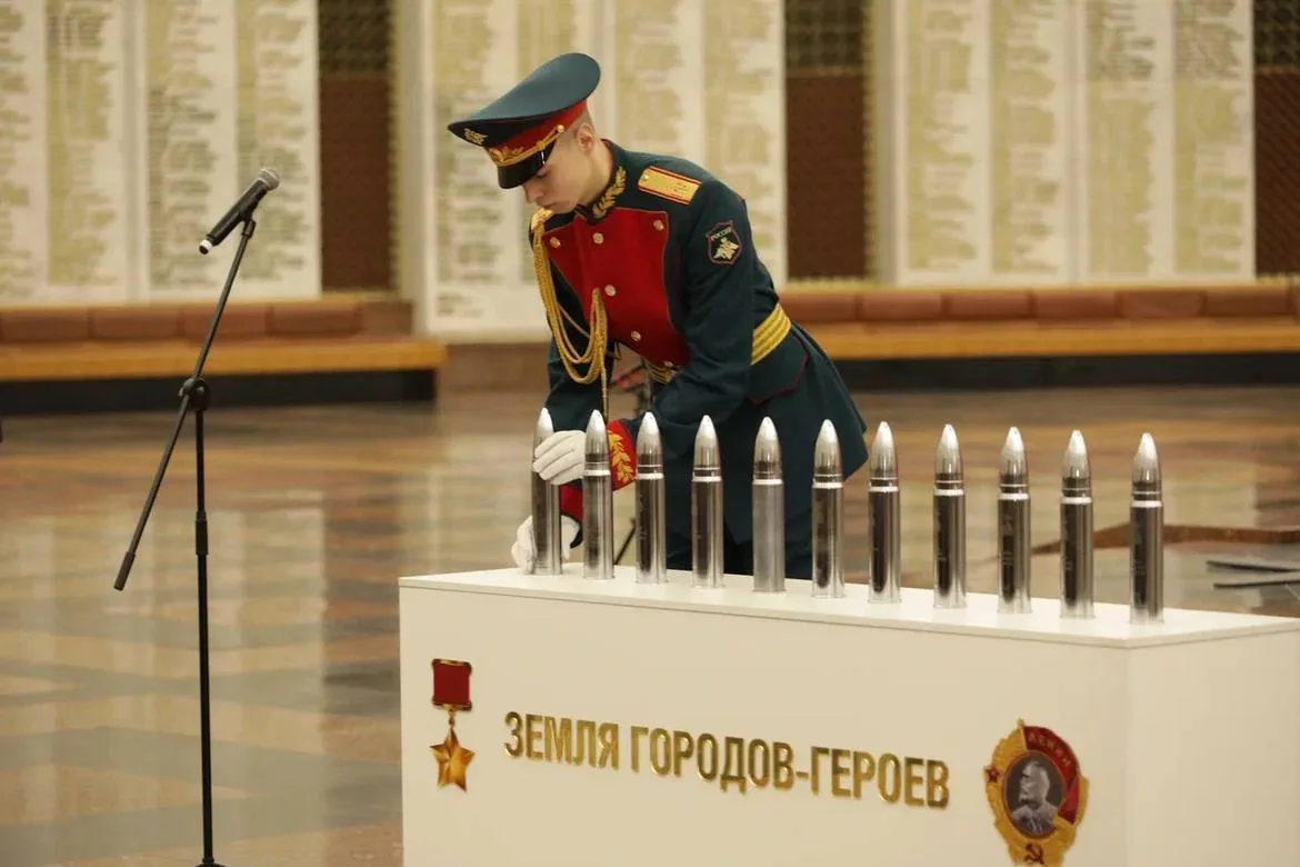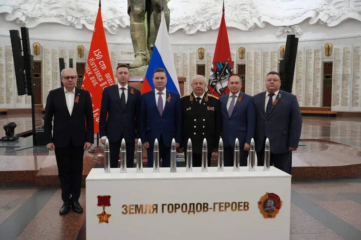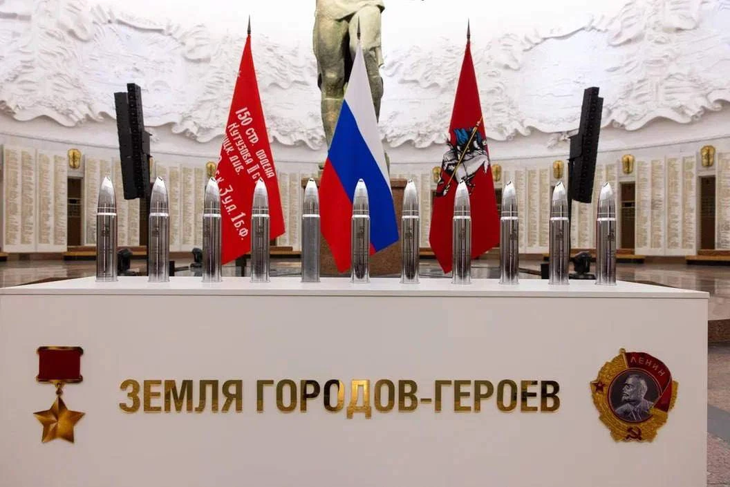 В стенах Музея Победы состоялась торжественная передача 11 капсул с землей городов-героев, собранной на мемориальных комплексах и полях сражений времён Великой Отечественной войны - как в России, так и в Беларуси, включая легендарную Брестскую крепость.