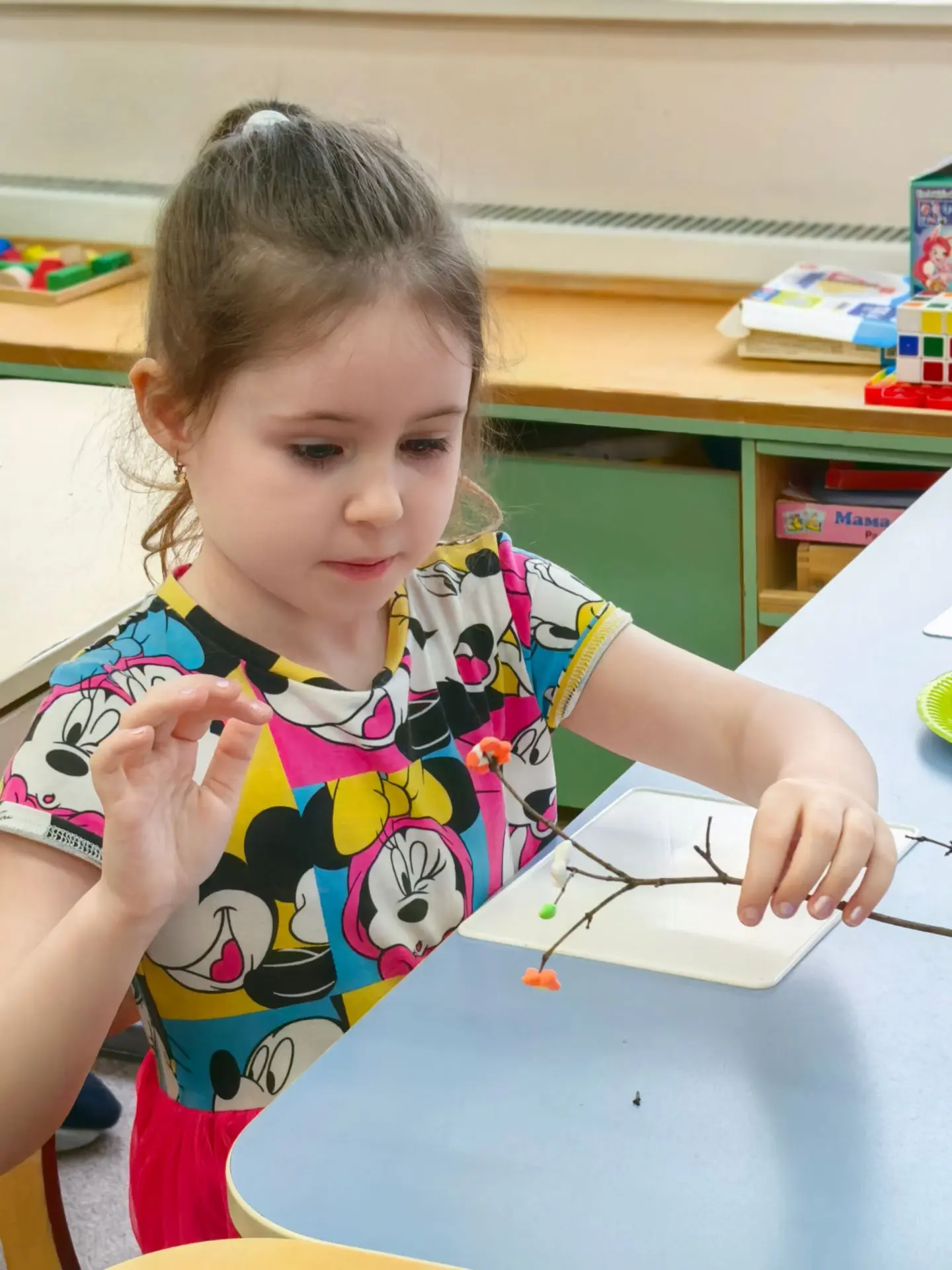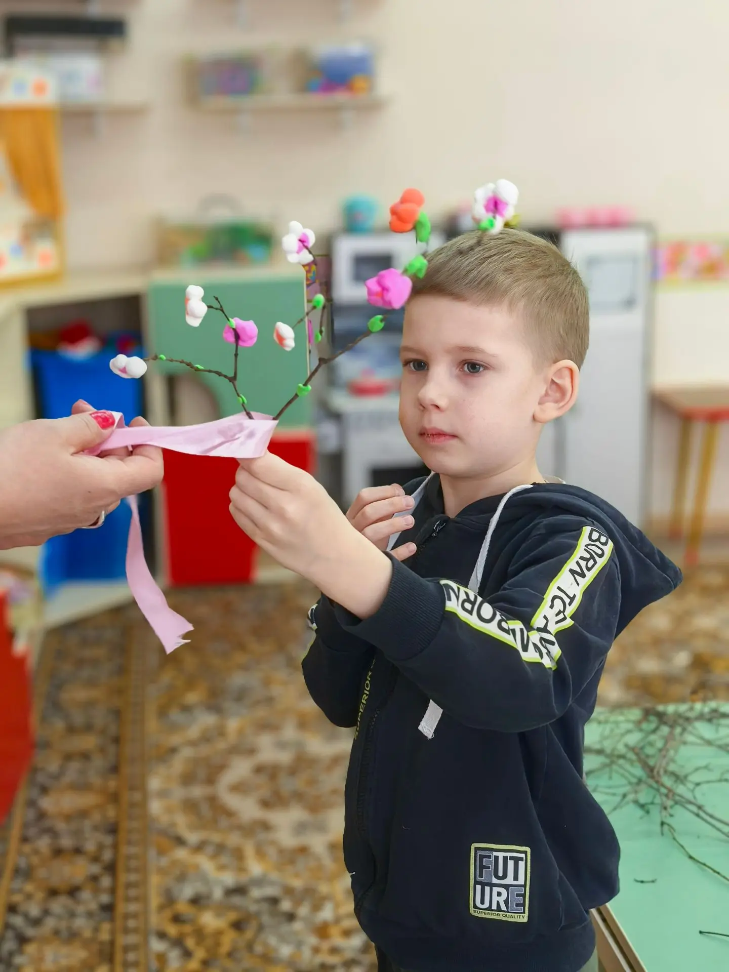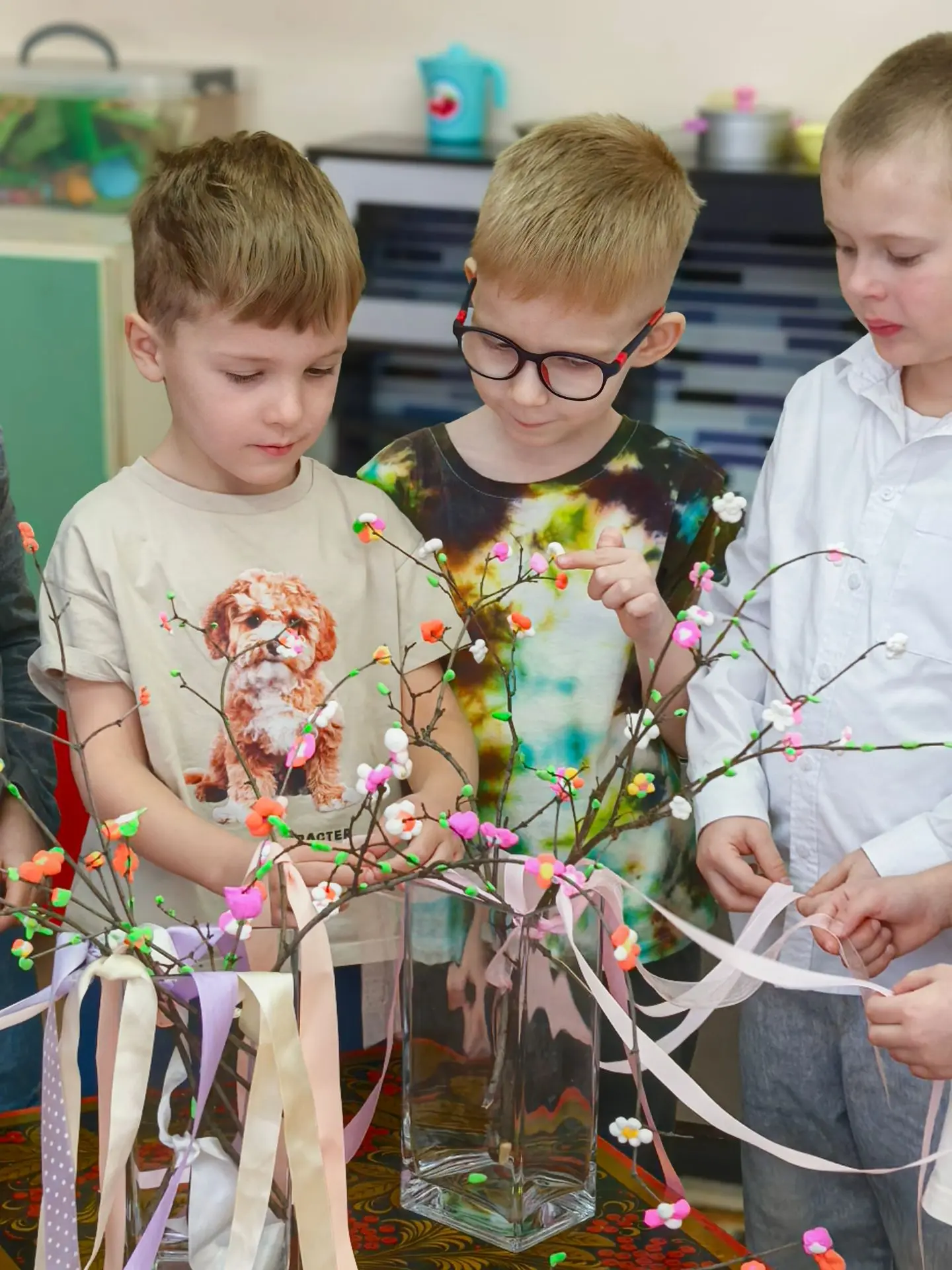 🌸Ребята взяли самые обычные веточки, которые нашли на прогулке, и вдохнули в них жизнь с помощью воздушного пластилина. Посмотрите, какие нежные листочки и яркие цветы расцвели прямо у нас в группе!