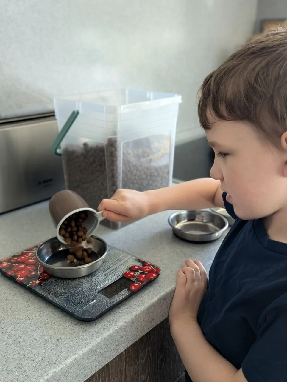 🥣Дома дети помогают надевать ошейники, загонять собак в ванную мыть лапы, собирают миски, приносят контейнер с кормом. Сын уже сам отмеряет порции на весах. Если все трое дома — распределяют миски между собой, и каждый ставит угощение "своей" собаке.