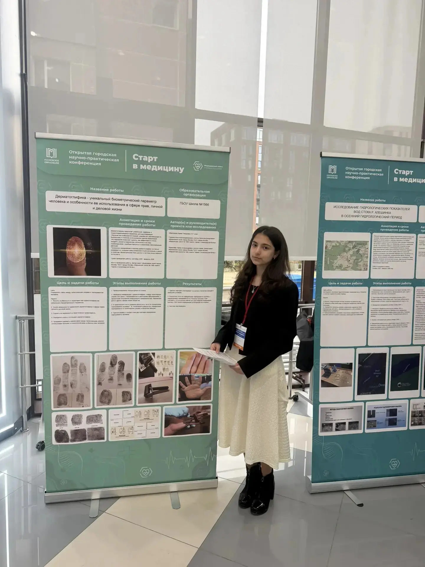 Нашу школу представляет ученица 10 «Г» класса Арина И. Она защищает работу по дерматоглифике.