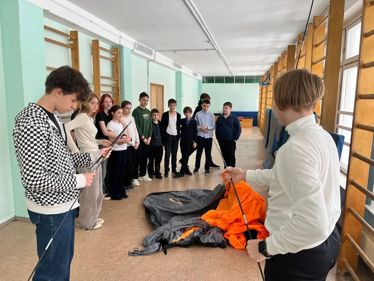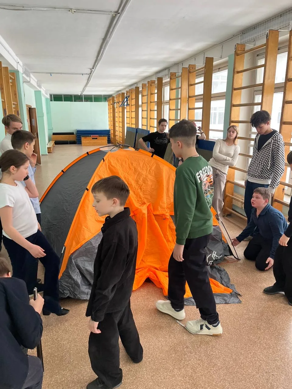 ⛺ В завершении все отправились в спортзал учиться ставить и разбирать палатку.
