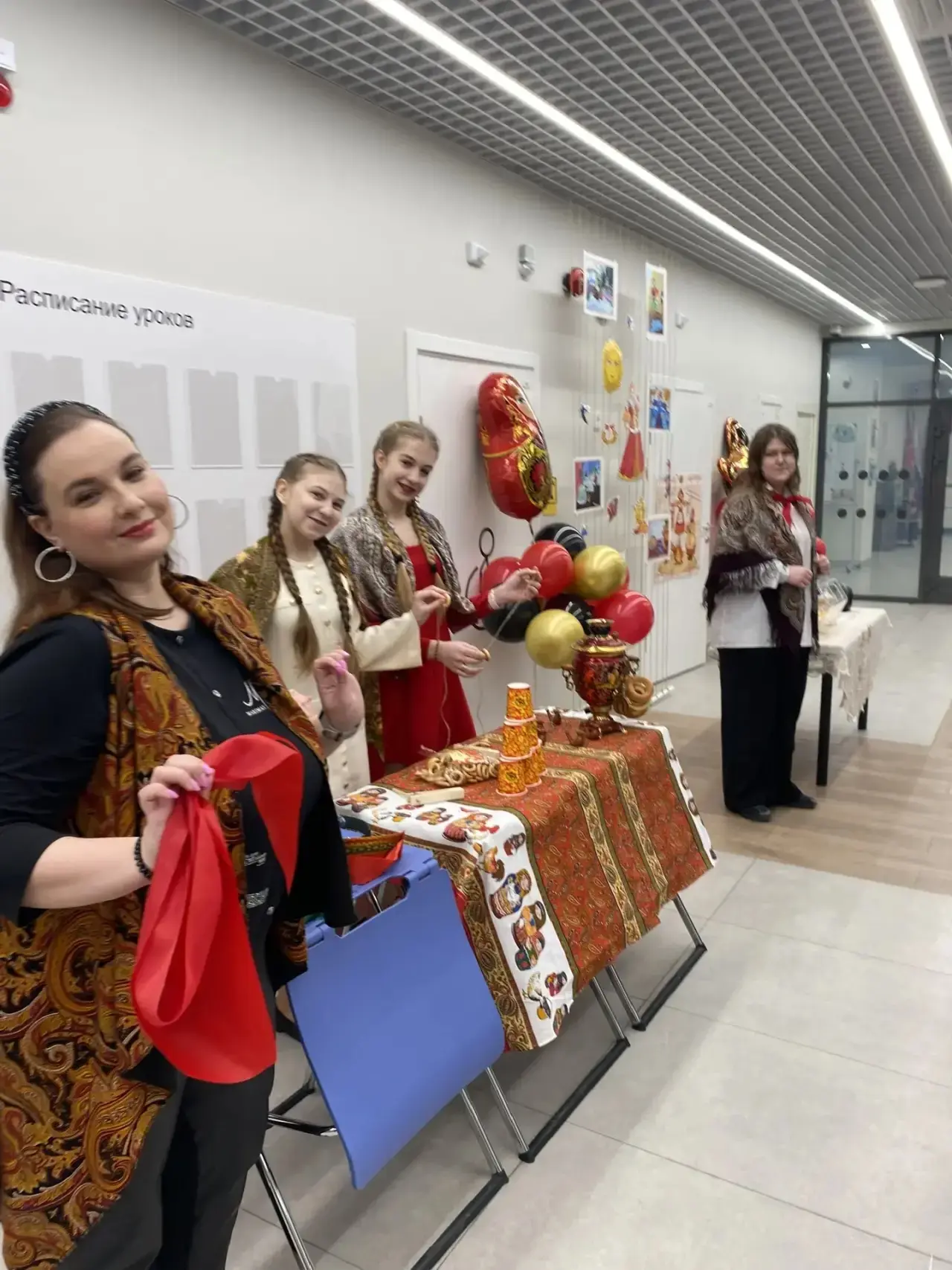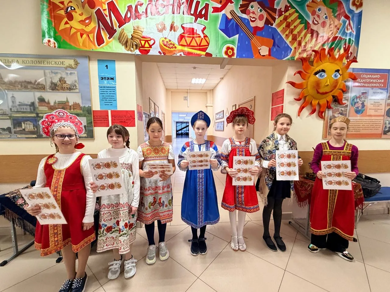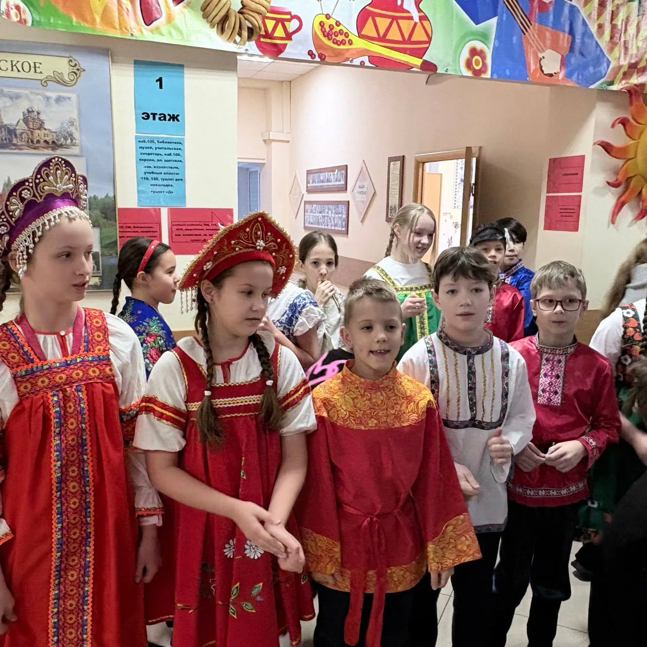 Вопреки законам физики ⚡️, скука испарилась моментально. Школьный коридор было не узнать: всех встречало буйство красок, яркие платки и улыбки. Украшение школы к Масленице 🌼🎨 задало тон всему празднику — тепло и солнечно, словно первый весенний день заглянул к нам в гости!