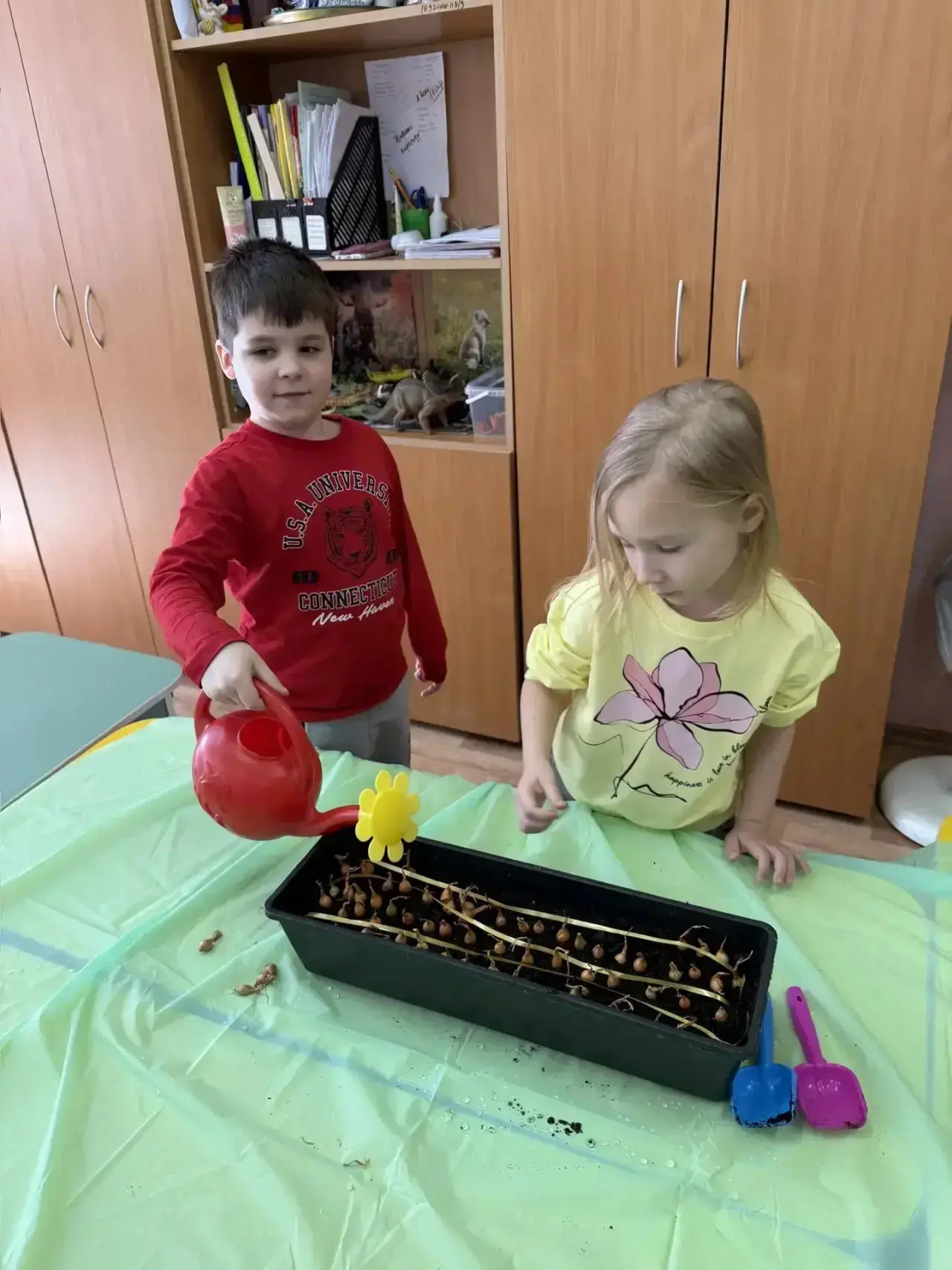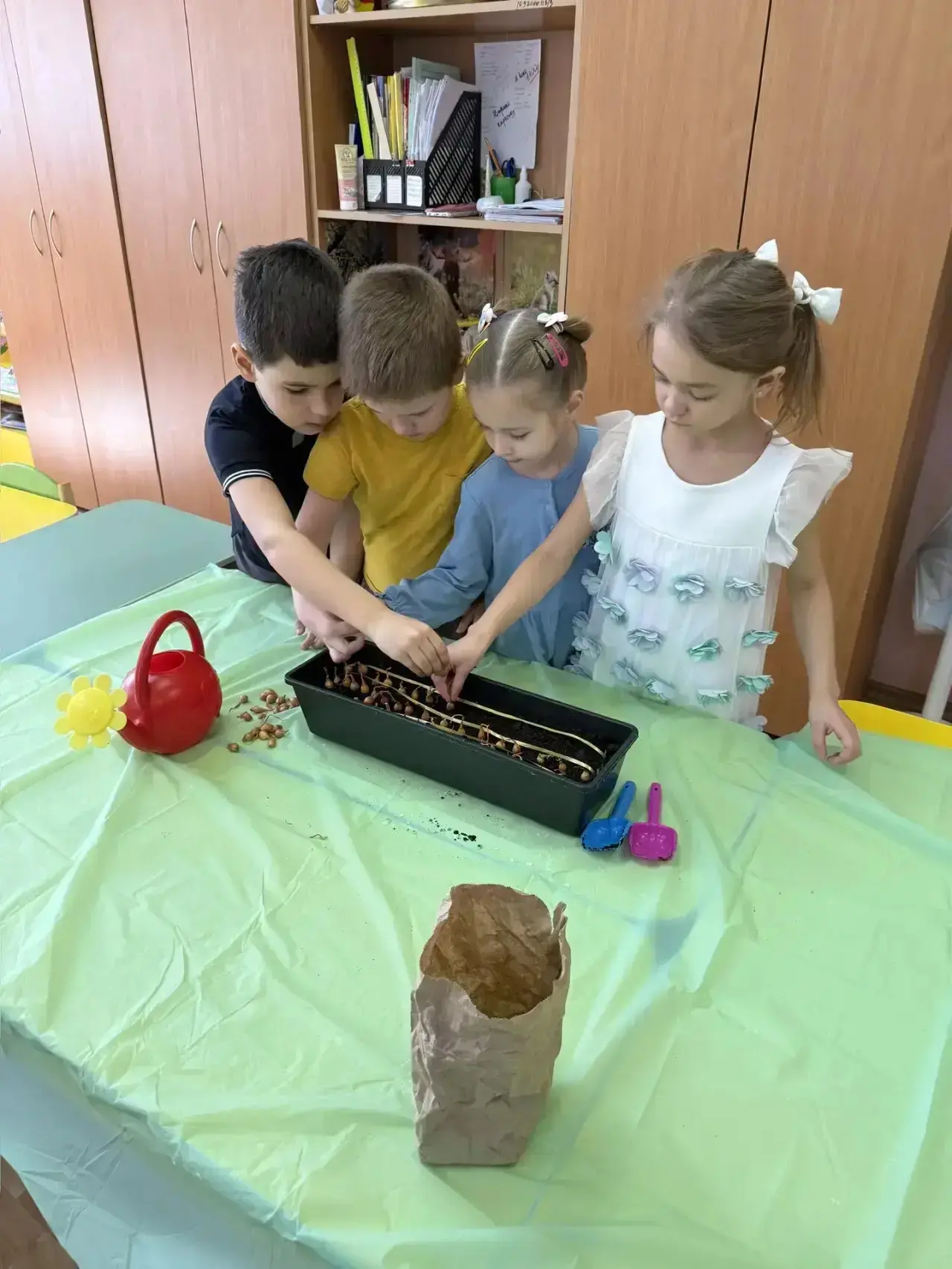 🌿 научились сажать лук. Теперь они знают, что луковицу нужно помещать в землю донцем вниз, а для роста растениям нужны свет, тепло и вода;
