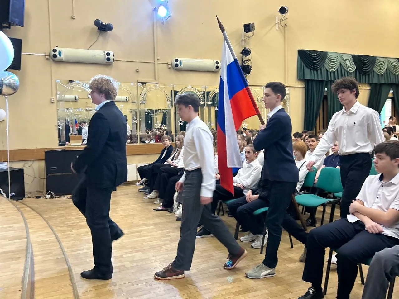 Сегодня в нашей школе прошла торжественная церемония поднятия Государственного флага Российской Федерации. На торжественной линейке присутствовали ученики 9 «А»-1, 9 «Б»-1, 9 «К»-1 9 «М»-1 и 8 «Б»-1 классов, Знаменная группа - ученики 9 «К»-1 кадетского класса.