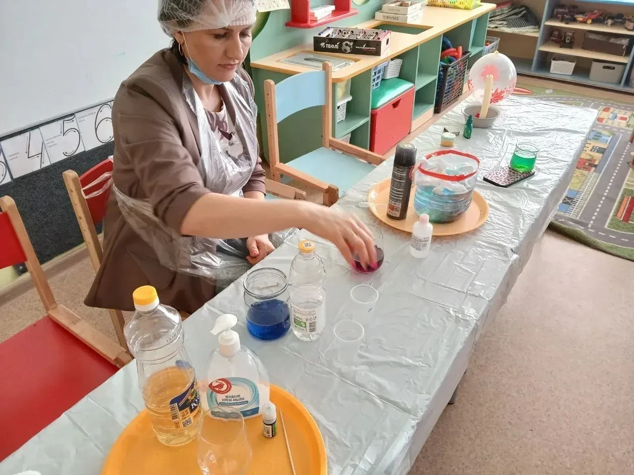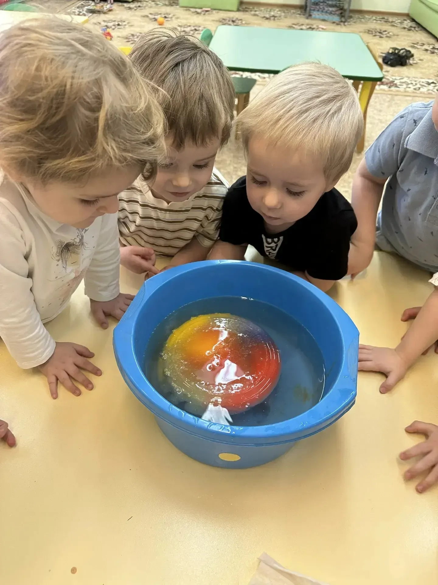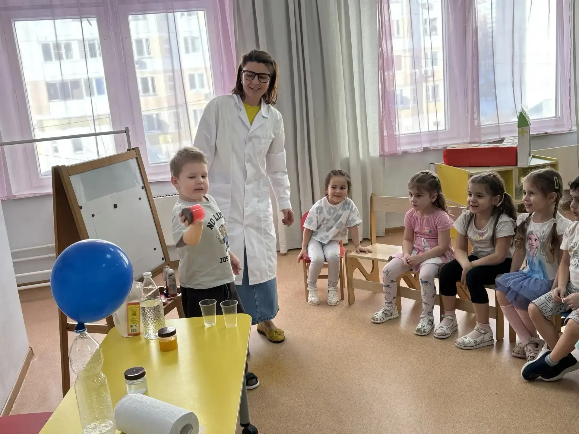 В группе «Звездочки» Неделя науки удалась на славу: тут был и вулкан, и рисование цветным льдом, и опыт с мандаринами. А завершилось все визитом гостьи — мамы Кирилла, которая показала чудо-эксперимент с мыльными пузырями!