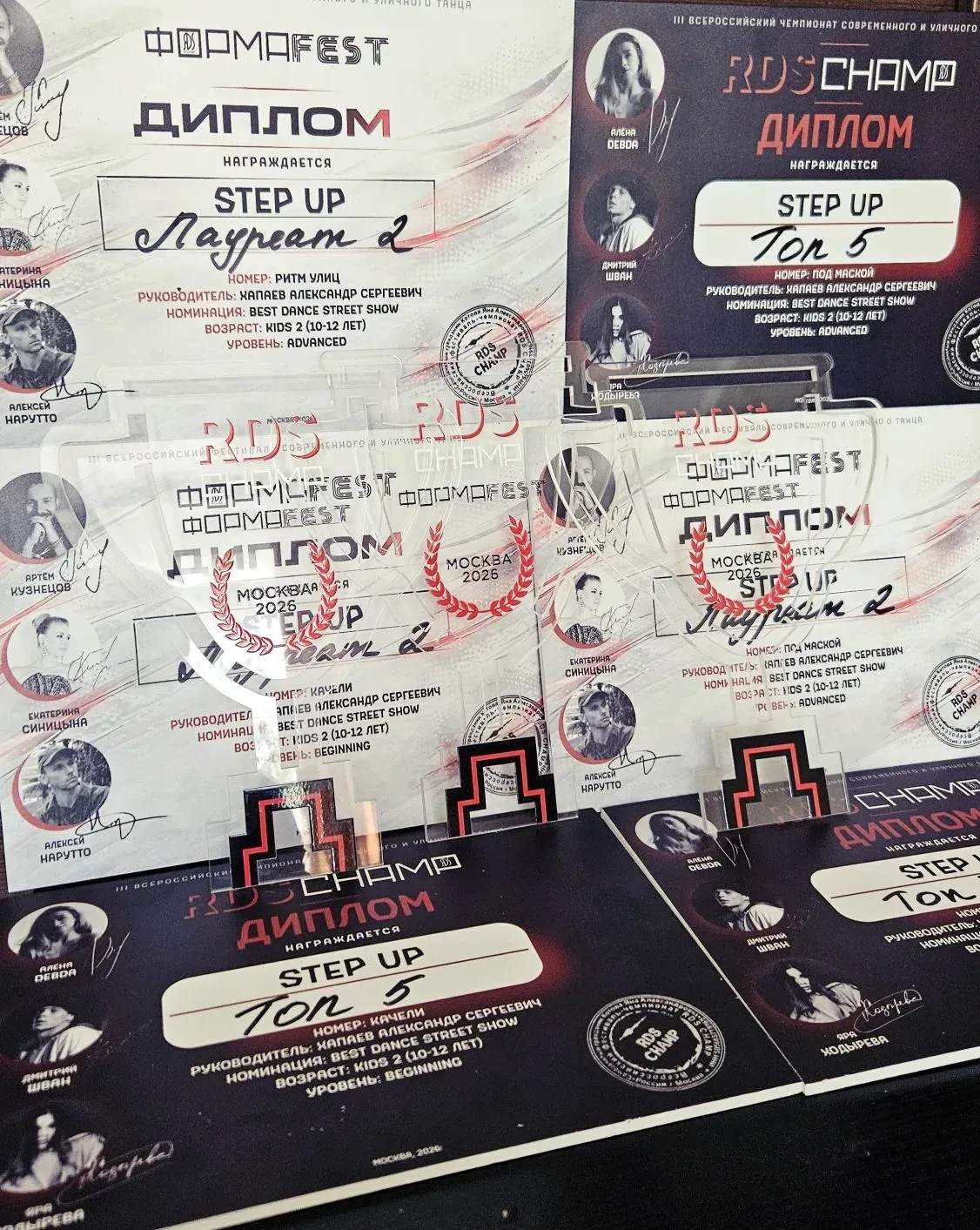 🏆 Ребята выступили достойно! Средняя группа дебютировала на большой сцене с номером «Качели», а старшая — показала судьям «Ритм улиц» и «Под маской». Результат — три диплома лауреатов II степени и вхождение в топ-5 номинации «Best dance street show»!