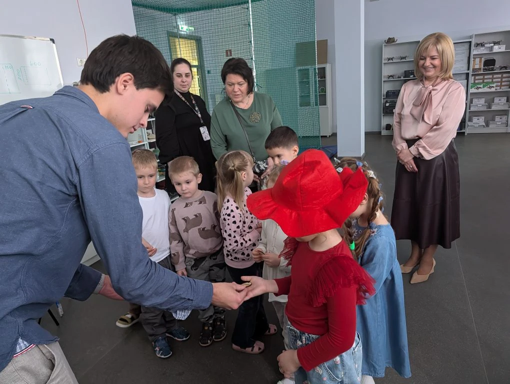 Вторая группа отправилась в инженерный класс, где главным экспонатом стал настоящий дрон. Ребятам не только показали устройство, но и позволили попробовать управлять им с пульта. Завершился визит вручением памятных подарков — деревянных брелоков с логотипом школы, изготовленных учениками 10Г.