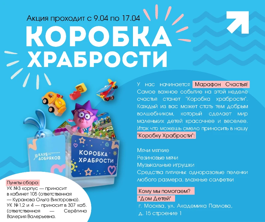 Но главное чудо случится благодаря «Коробке Храбрости». В ваших силах подарить детям, которые сейчас борются с болезнями, улыбку и капельку храбрости. Для этого нужно совсем немного — поделиться тем, что лежит у вас дома или куплено специально для них.