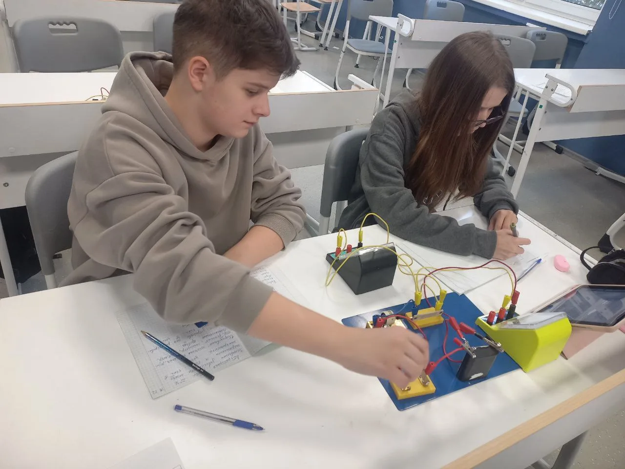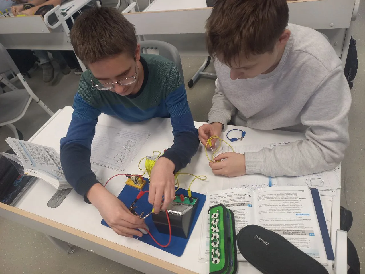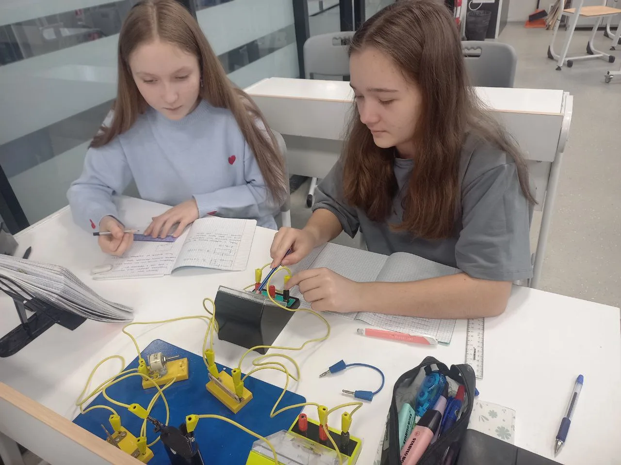 Тема занятия — «Установление зависимости силы тока от напряжения на резисторе». Ребята собирали электрические цепи, проводили измерения и наблюдали, как изменяется сила тока при изменении напряжения ⚙️