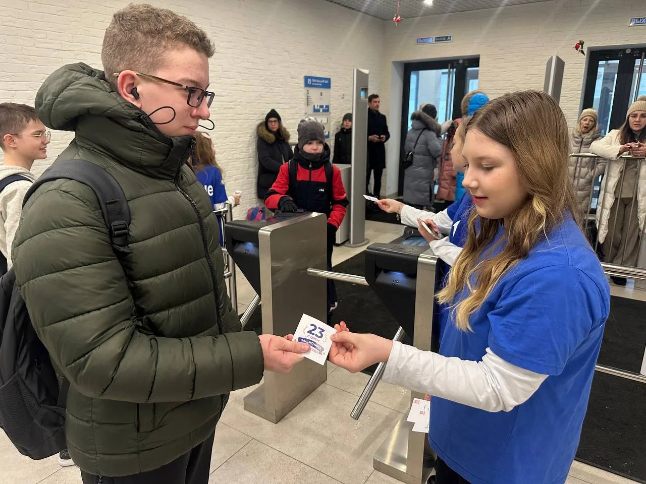 👏🏻Активисты Движения Первых раздавали ребятам открытки, чтобы каждый ученик смог поздравить своего папу или другого близкого мужчину с праздником.